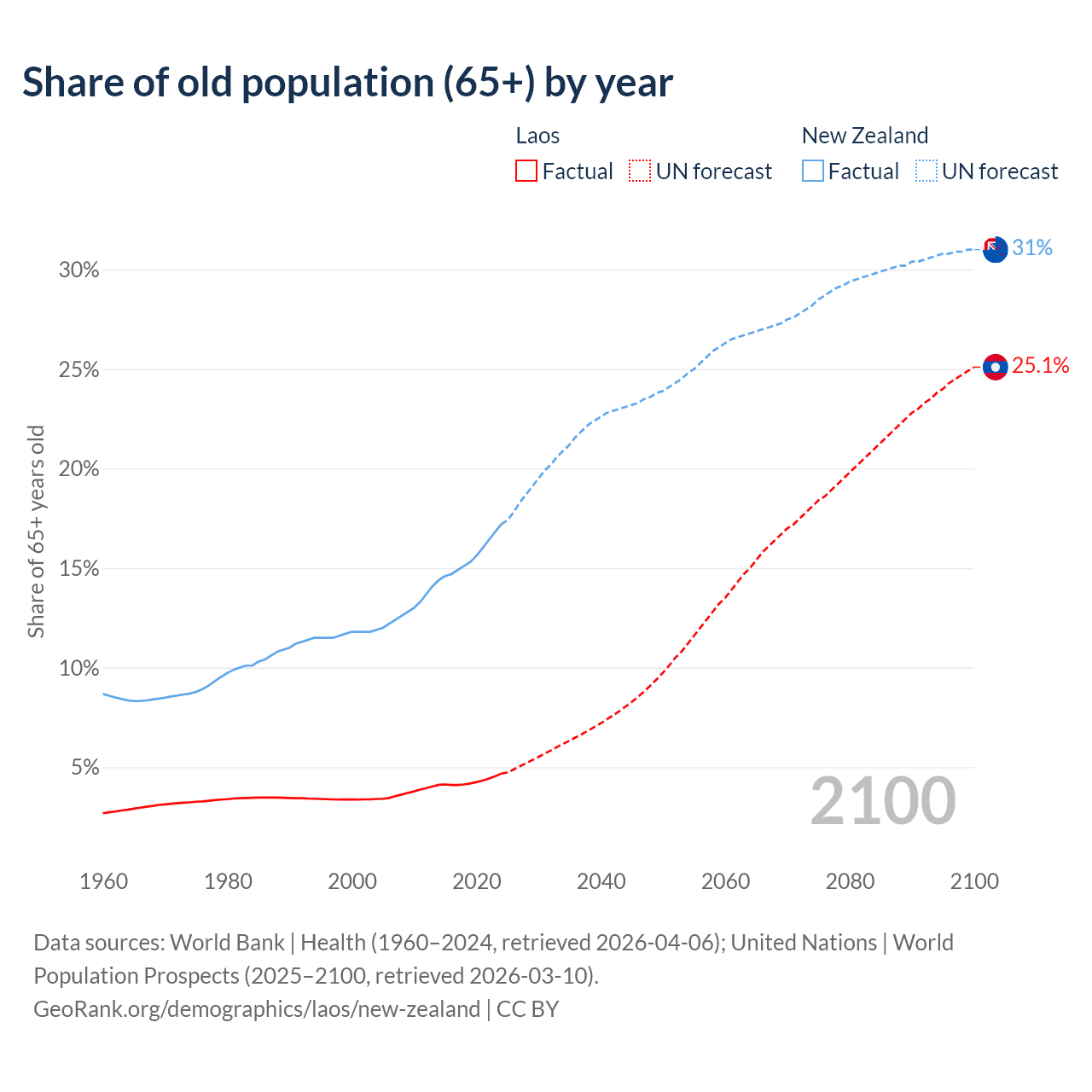 - The share of old-age demographic (65+) in Laos is 4.67% vs 17.2% in New Zealand.