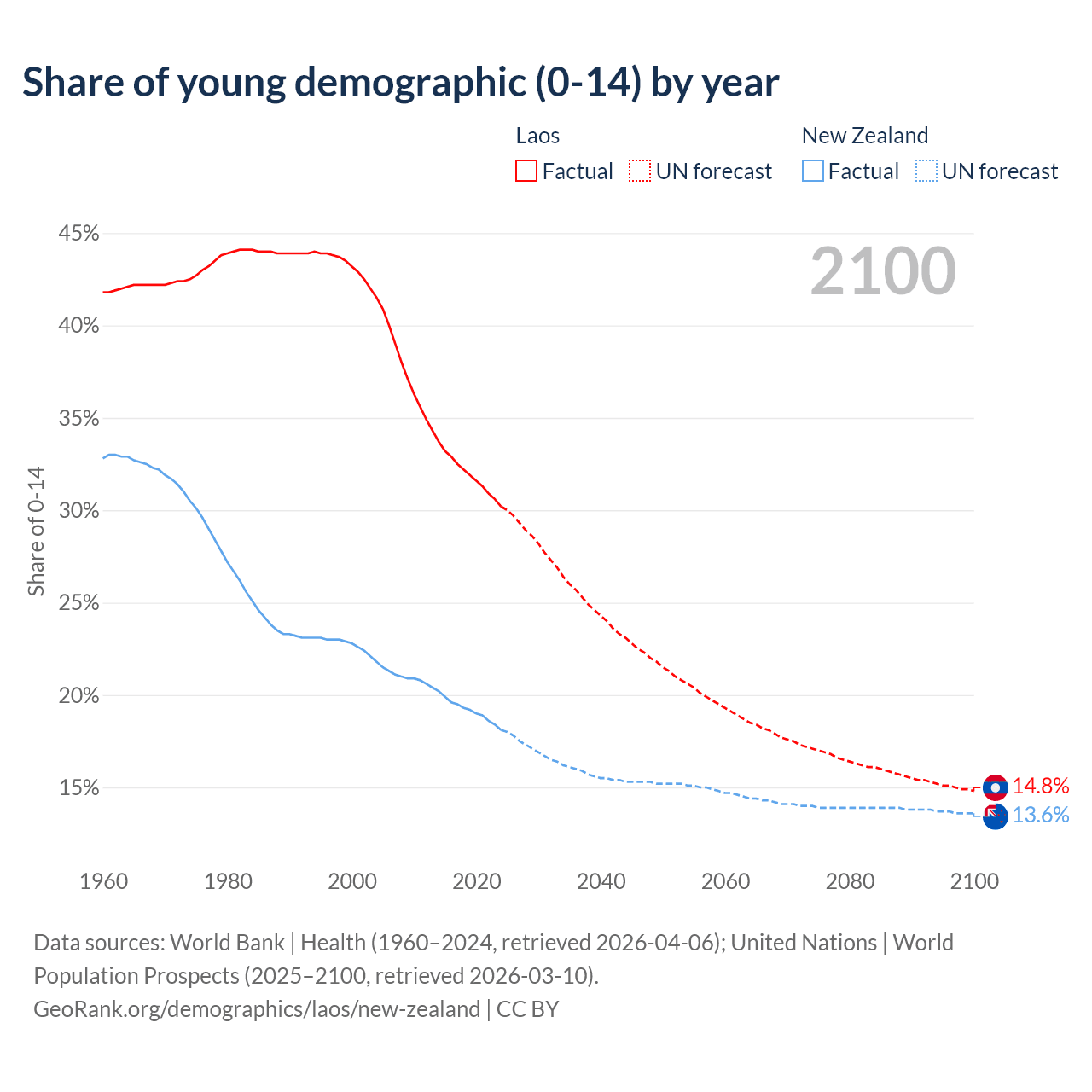 - The share of young demographic (0-15 years old) in Laos is 30.2% vs 18.1% in New Zealand.