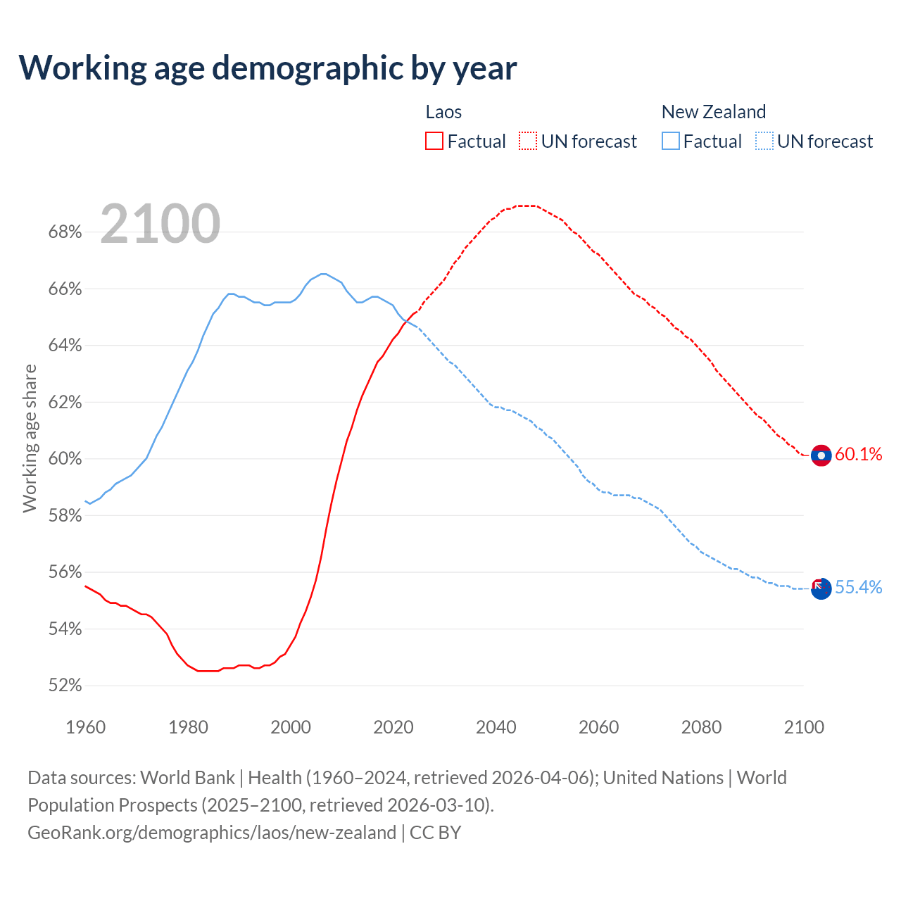 - Laos has 5.21M working age adults (aged 15-64) vs 3.48M in New Zealand.