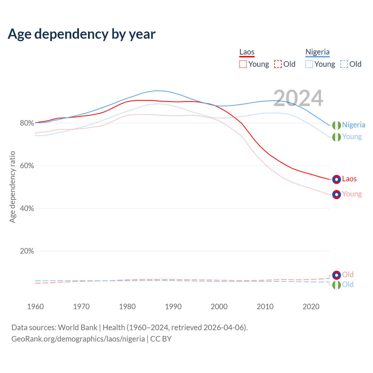 - Laos is ranked 130/196 by median age (oldest to youngest) vs 178/196 for Nigeria.