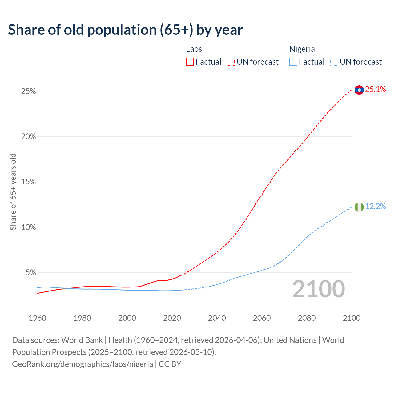 - The share of old-age demographic (65+) in Laos is 4.67% vs 3.05% in Nigeria.