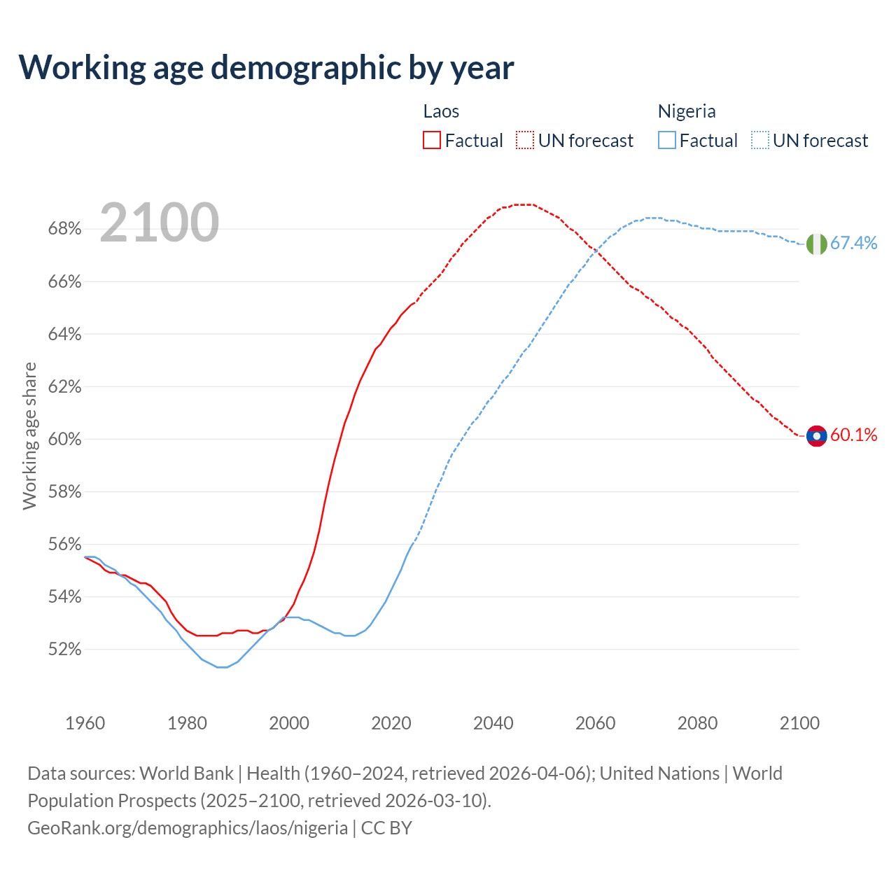 - Laos has 5.21M working age adults (aged 15-64) vs 136M in Nigeria.