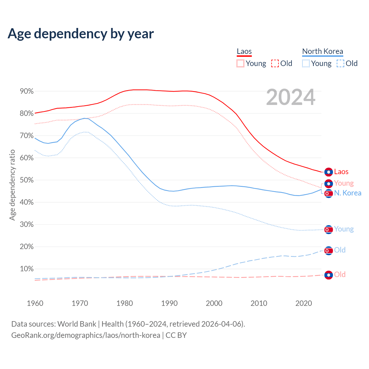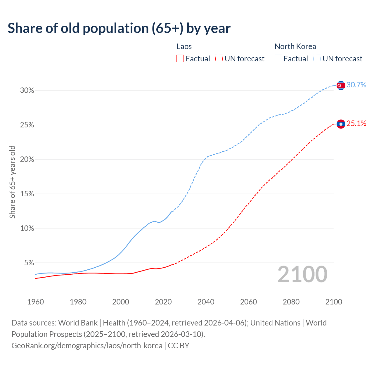 The share of older people aged 65 and over is 4.67% in Laos and 12.4% in North Korea. Life expectancy in Laos compared to North Korea .