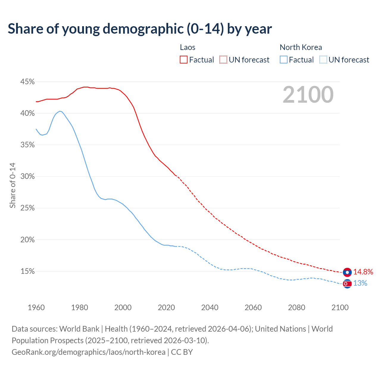 - The share of young demographic (0-15 years old) in Laos is 30.2% vs 18.9% in North Korea.