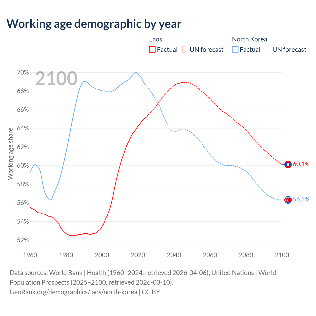 Median age Laos vs North Korea, 1960-2100