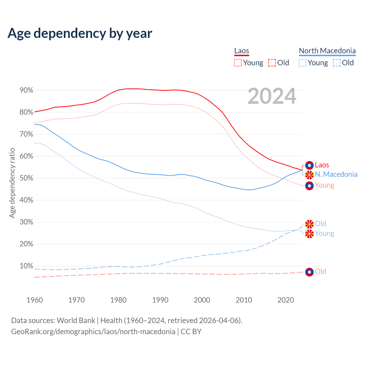 - The share of old-age demographic (65+) in Laos is 4.67% vs 18% in North Macedonia.