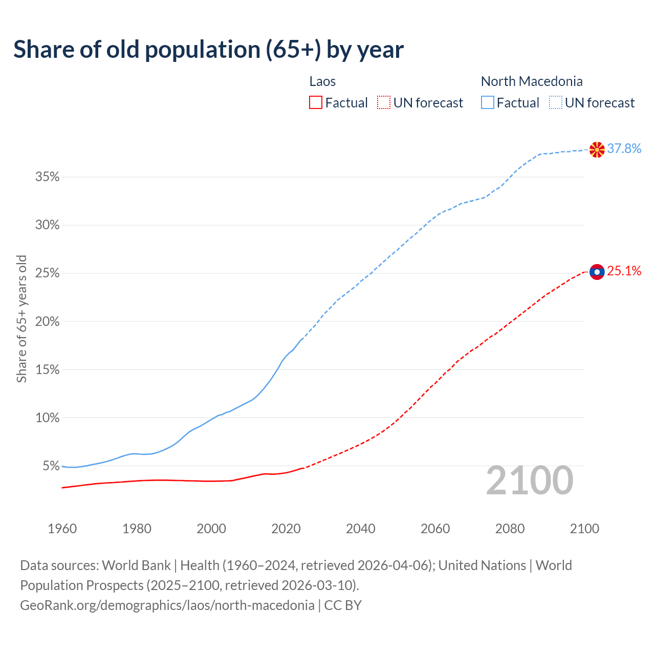 The share of older people aged 65 and over is 4.67% in Laos and 18% in North Macedonia. Life expectancy in Laos compared to North Macedonia .