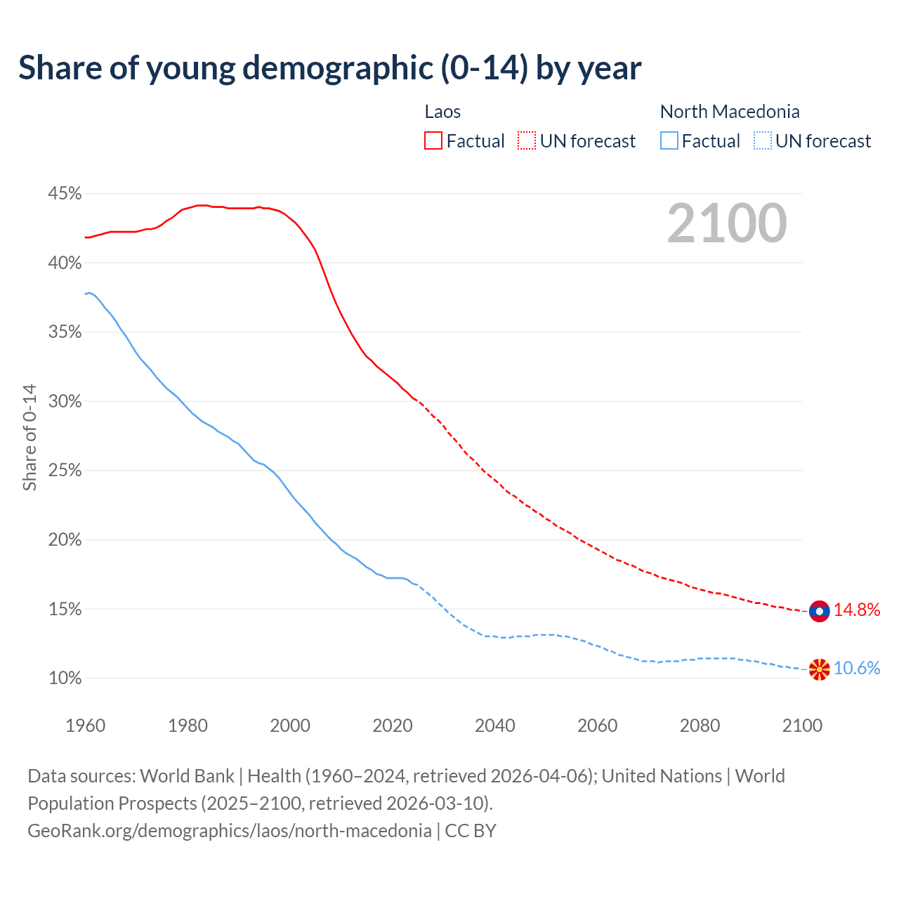- The share of young demographic (0-15 years old) in Laos is 30.2% vs 16.8% in North Macedonia.