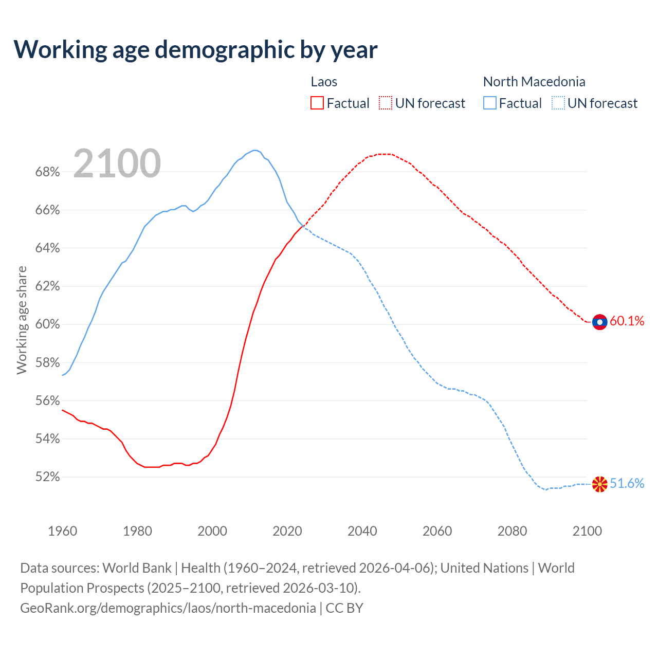 Median age Laos vs North Macedonia, 1960-2100