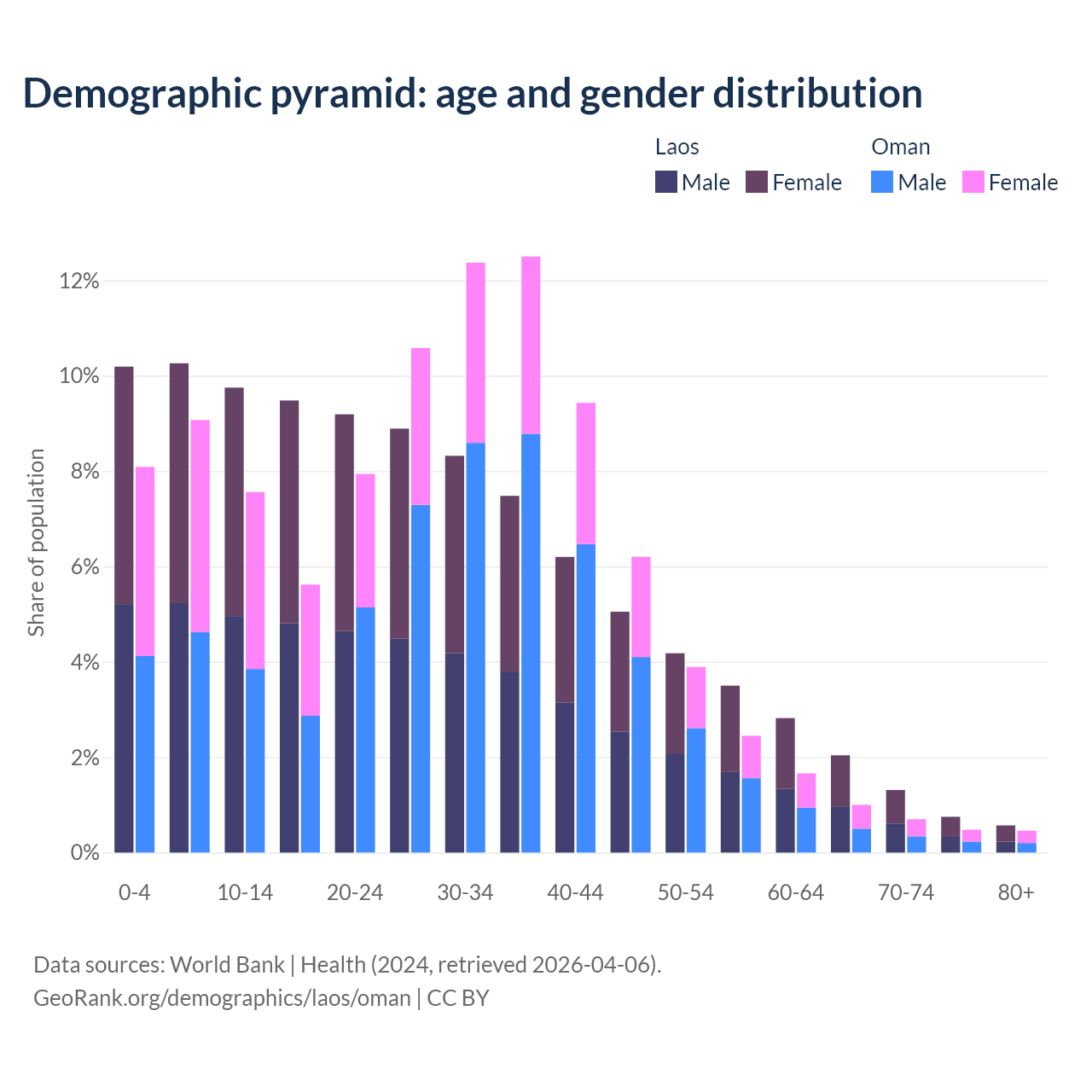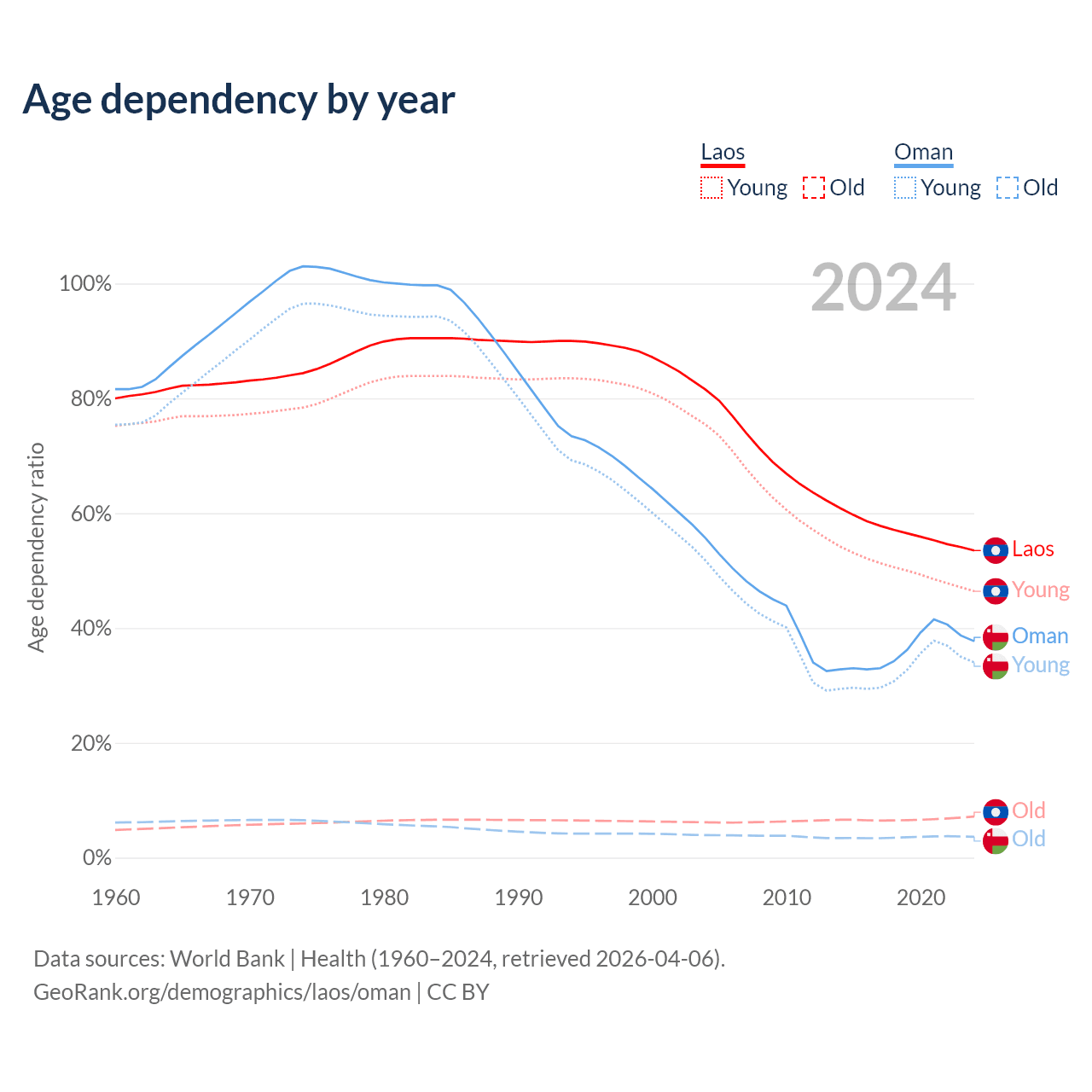 - Laos is ranked 130/196 by median age (oldest to youngest) vs 101/196 for Oman.