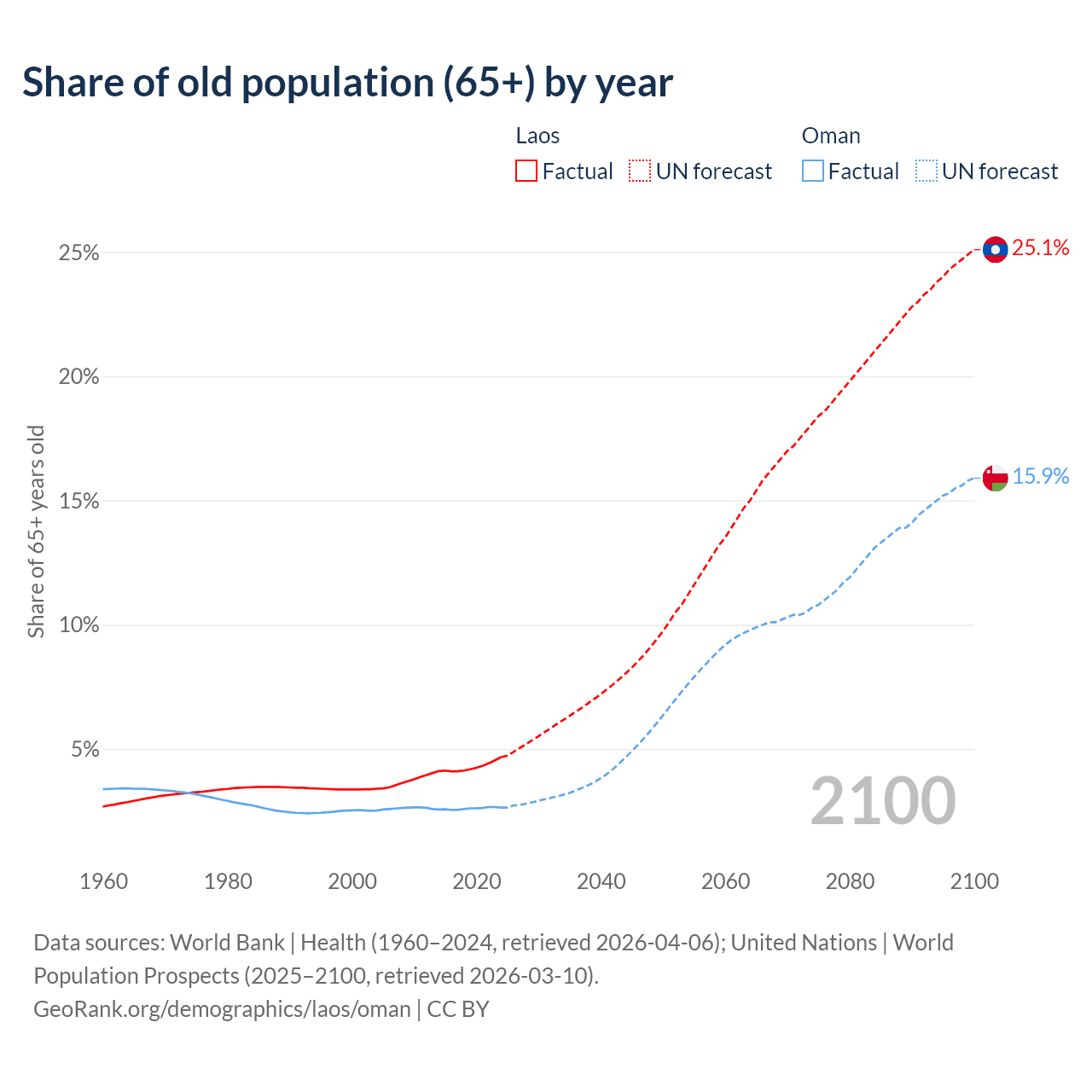 - The share of old-age demographic (65+) in Laos is 4.67% vs 2.64% in Oman.