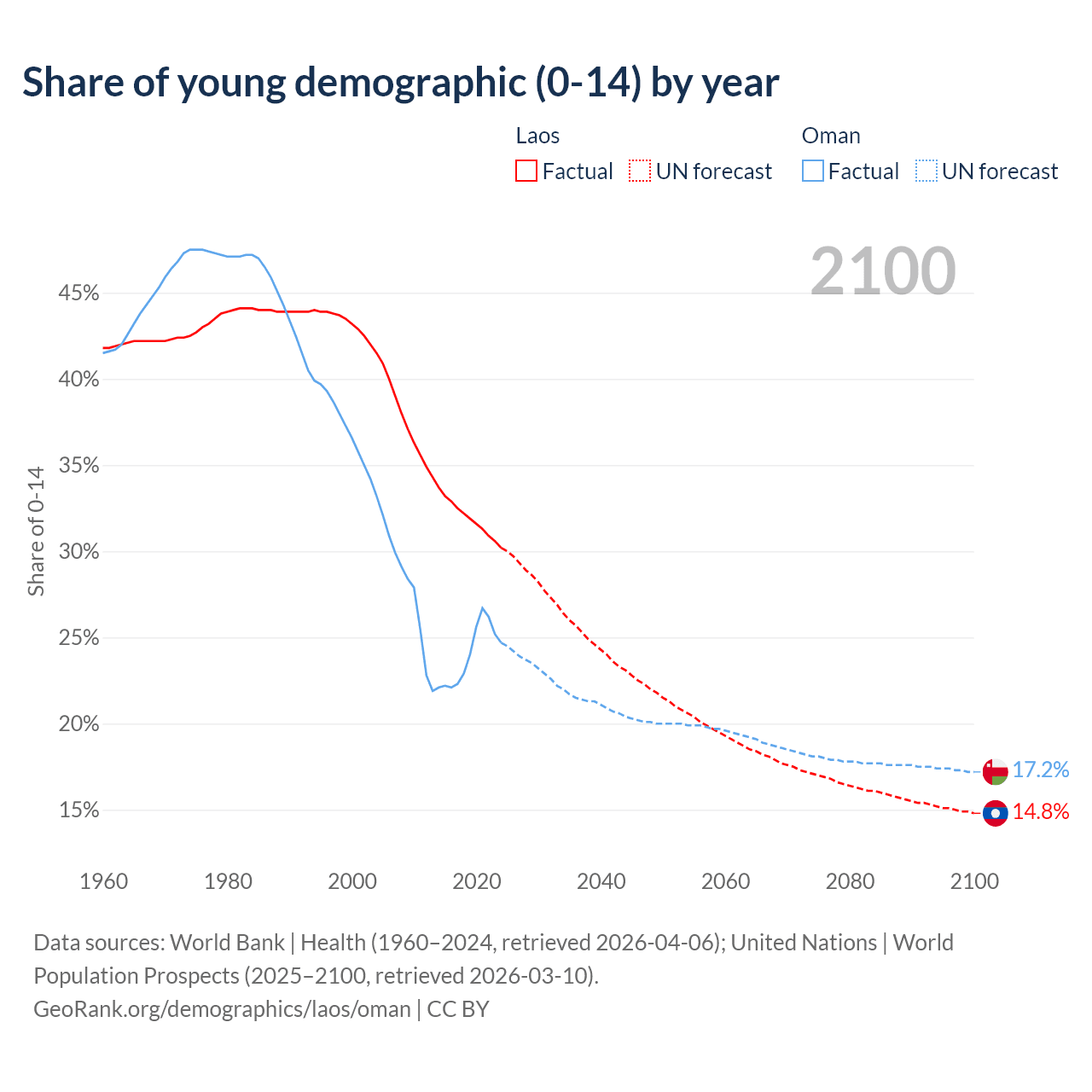 - The share of young demographic (0-15 years old) in Laos is 30.2% vs 24.7% in Oman.