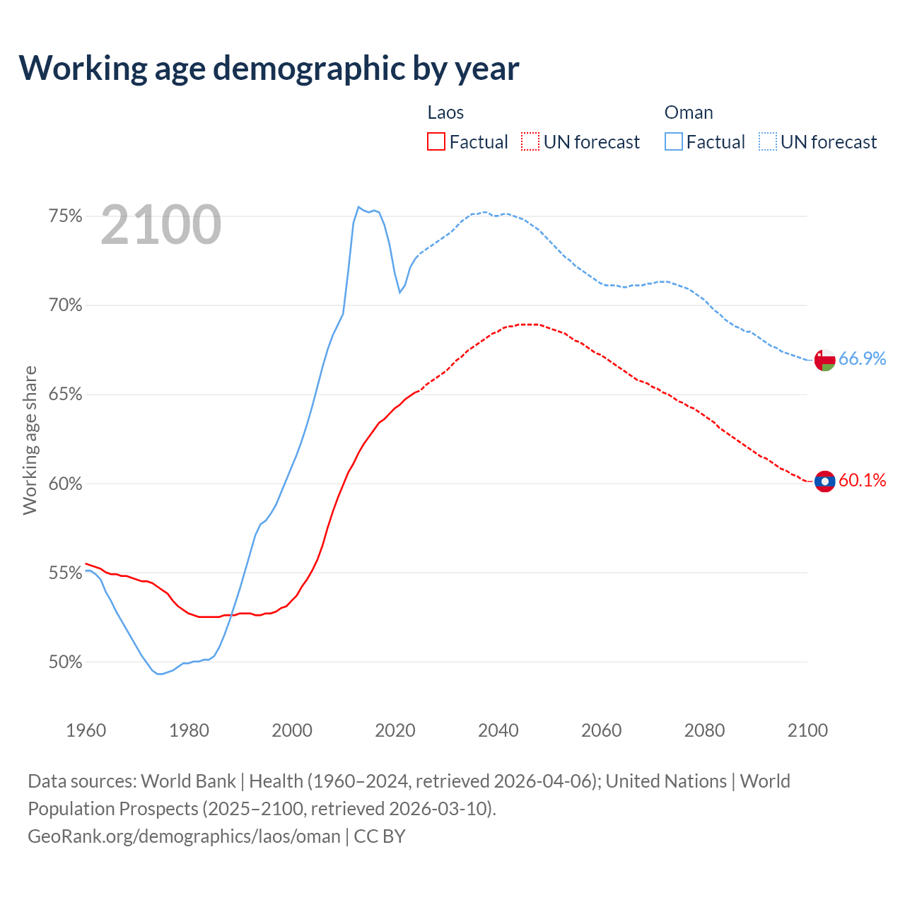 - Laos has 5.21M working age adults (aged 15-64) vs 4.19M in Oman.