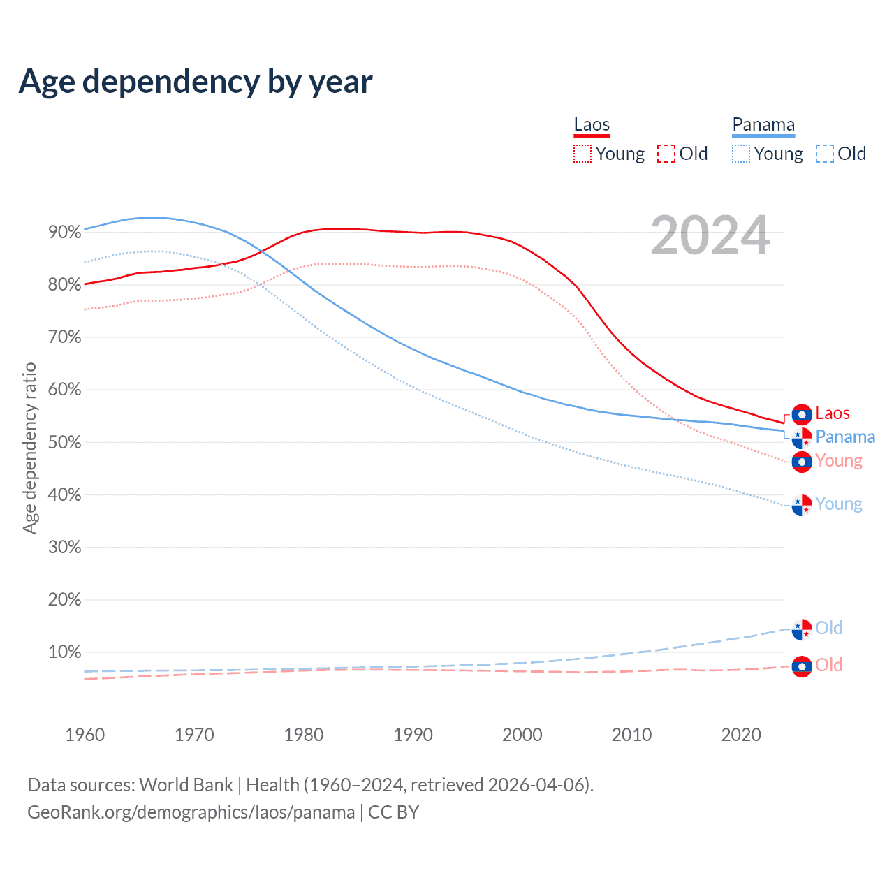 - Laos is ranked 130/196 by median age (oldest to youngest) vs 94/196 for Panama.