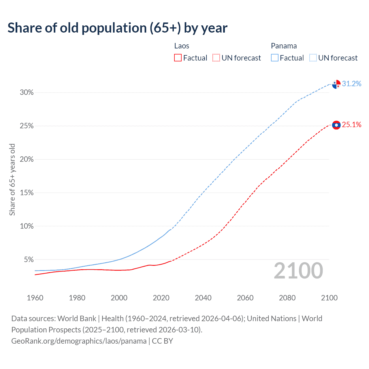 - The share of old-age demographic (65+) in Laos is 4.67% vs 9.35% in Panama.