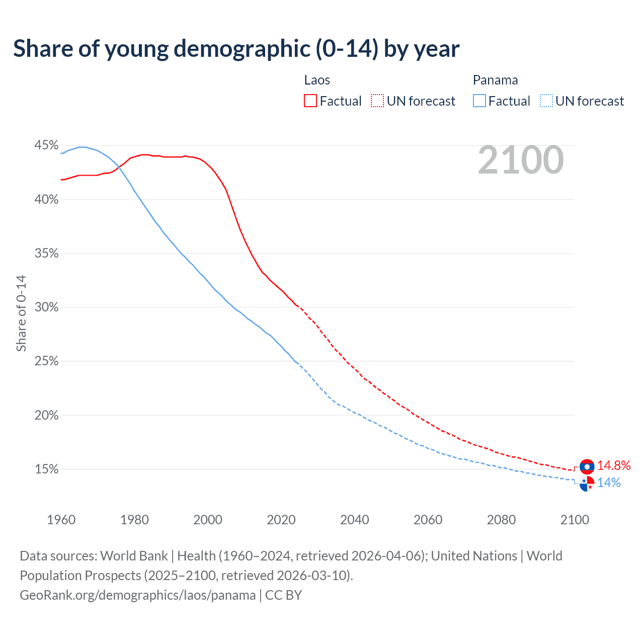 - The share of young demographic (0-15 years old) in Laos is 30.2% vs 24.9% in Panama.