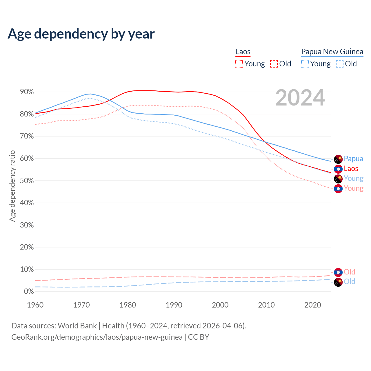 - Laos is ranked 130/196 by median age (oldest to youngest) vs 140/196 for Papua New Guinea.