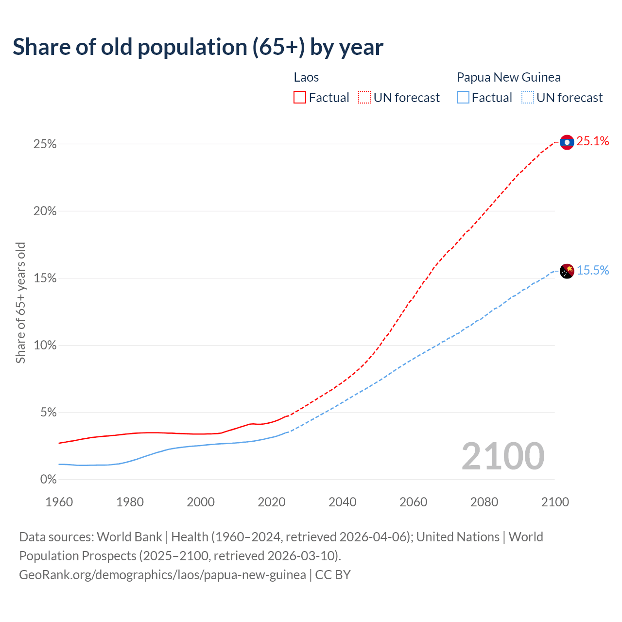 - The share of old-age demographic (65+) in Laos is 4.67% vs 3.46% in Papua New Guinea.