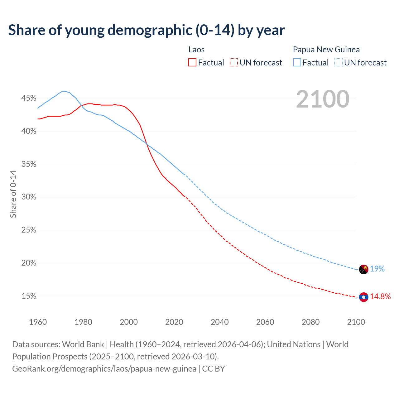 Median age Laos vs Papua New Guinea, 1960-2100