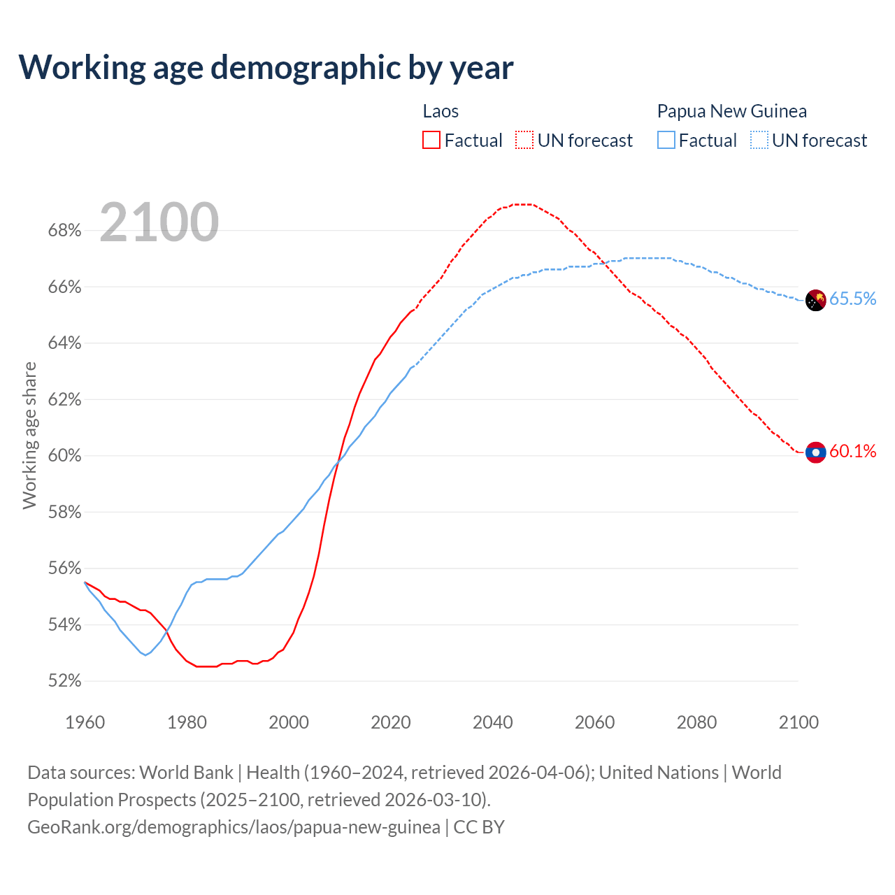 The share of older people aged 65 and over is 4.67% in Laos and 3.46% in Papua New Guinea. Life expectancy in Laos compared to Papua New Guinea .