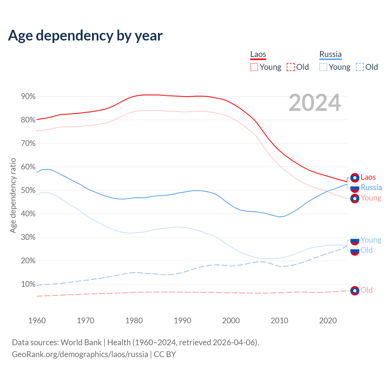 - Laos is ranked 130/196 by median age (oldest to youngest) vs 42/196 for Russia.