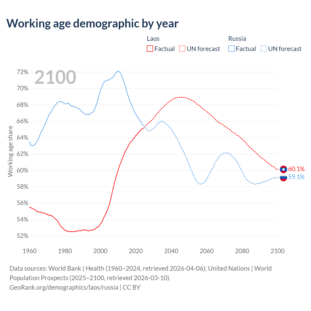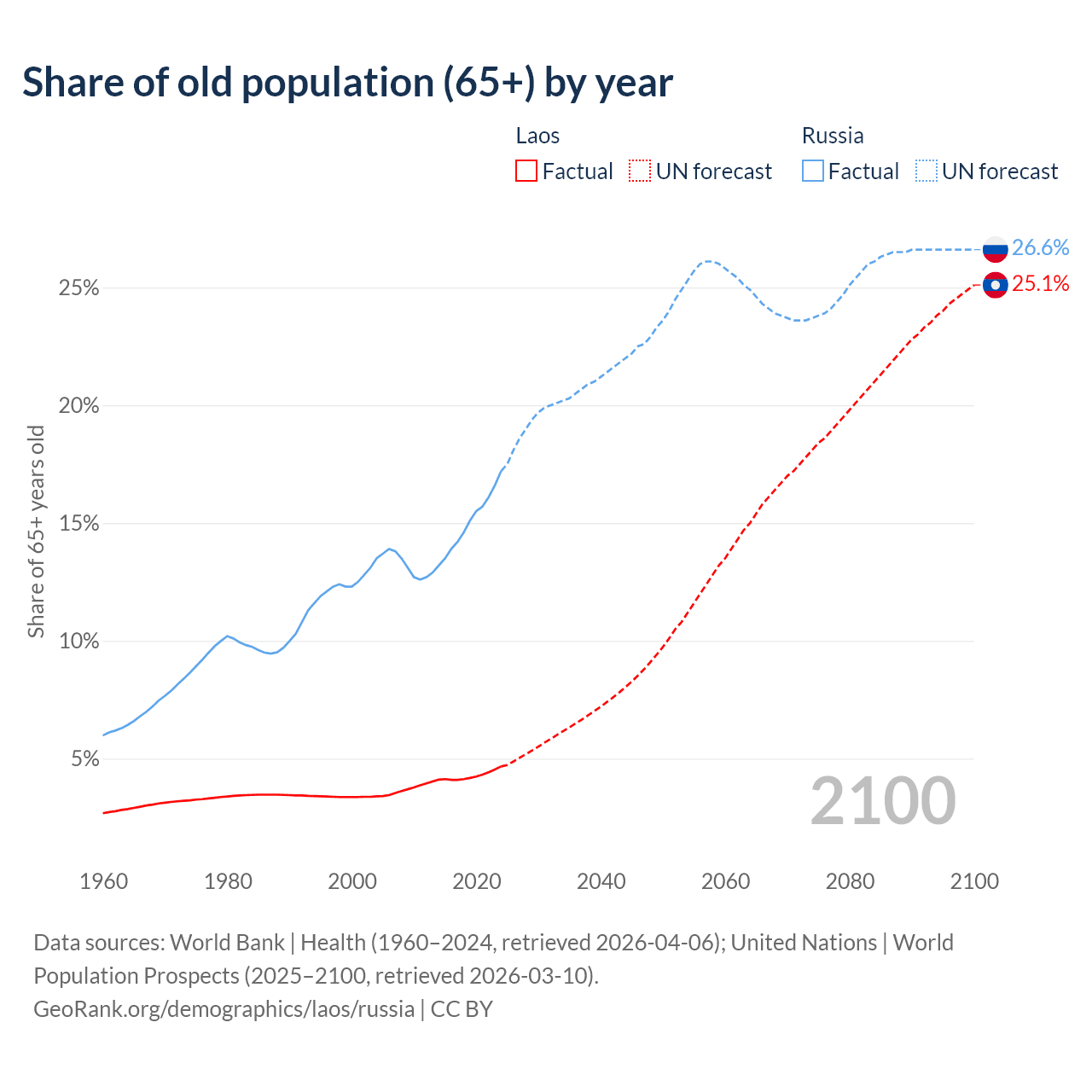 The share of older people aged 65 and over is 4.67% in Laos and 17.2% in Russia. Life expectancy in Laos compared to Russia .