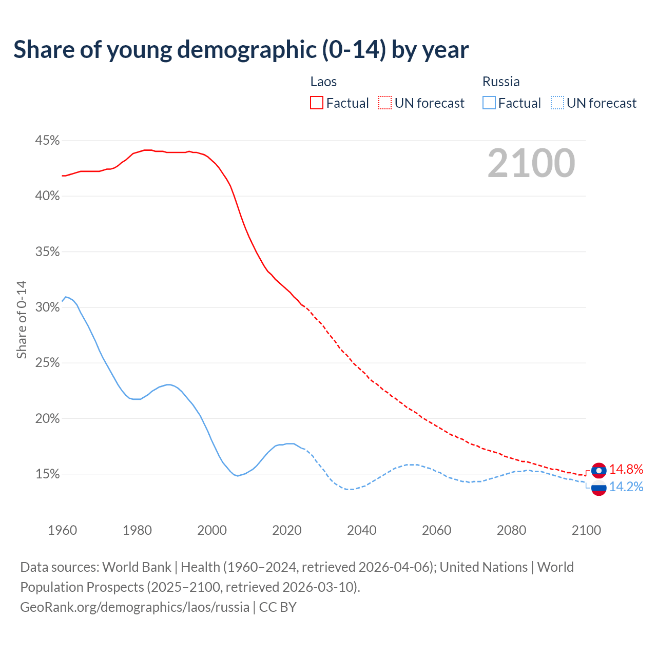 - The share of young demographic (0-15 years old) in Laos is 30.2% vs 17.3% in Russia.