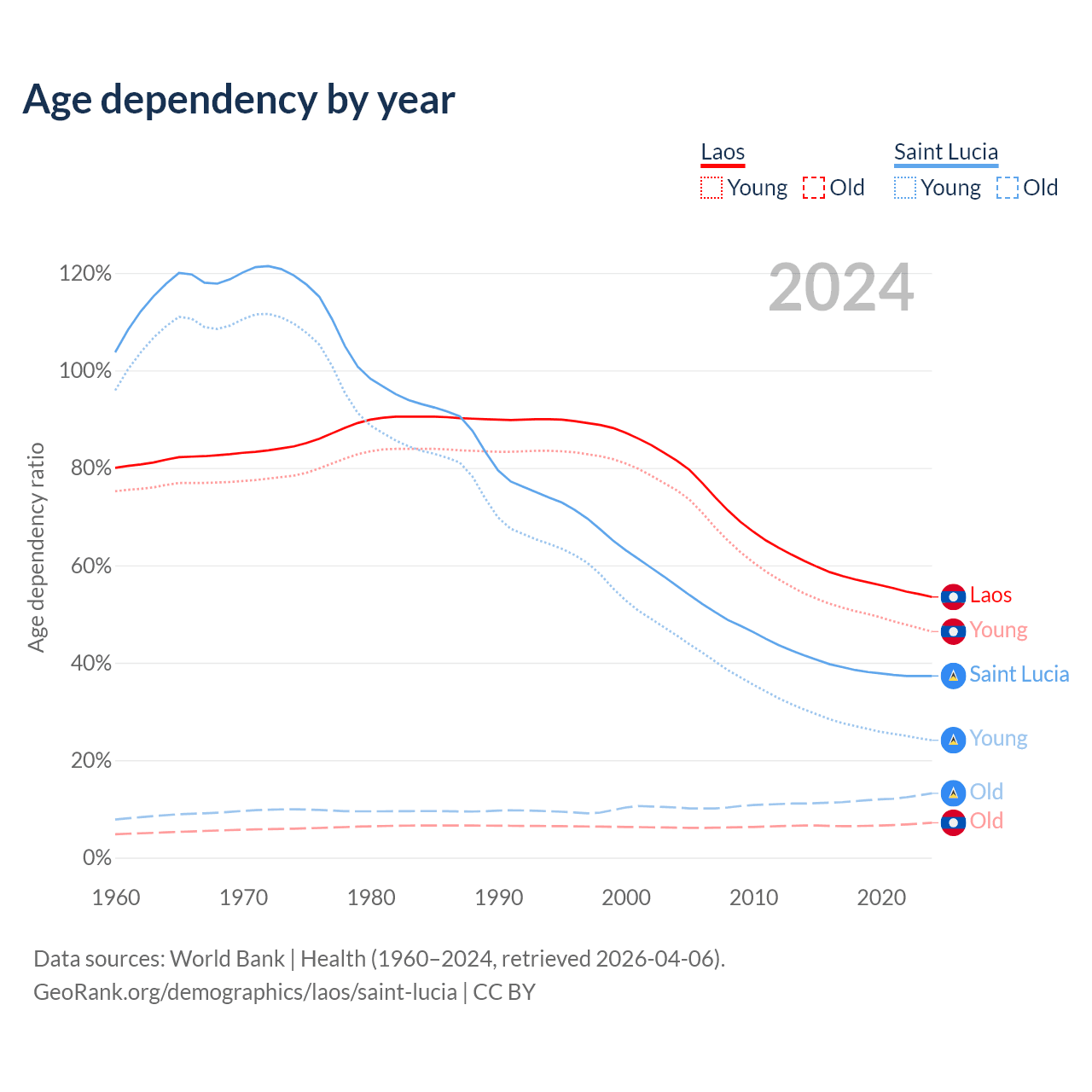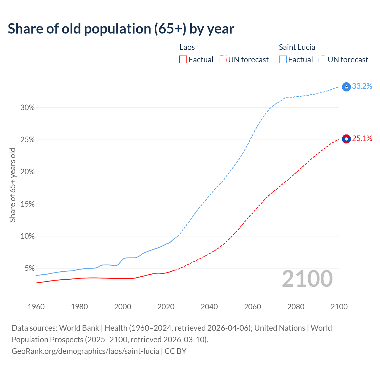 - The share of old-age demographic (65+) in Laos is 4.67% vs 9.62% in Saint Lucia.