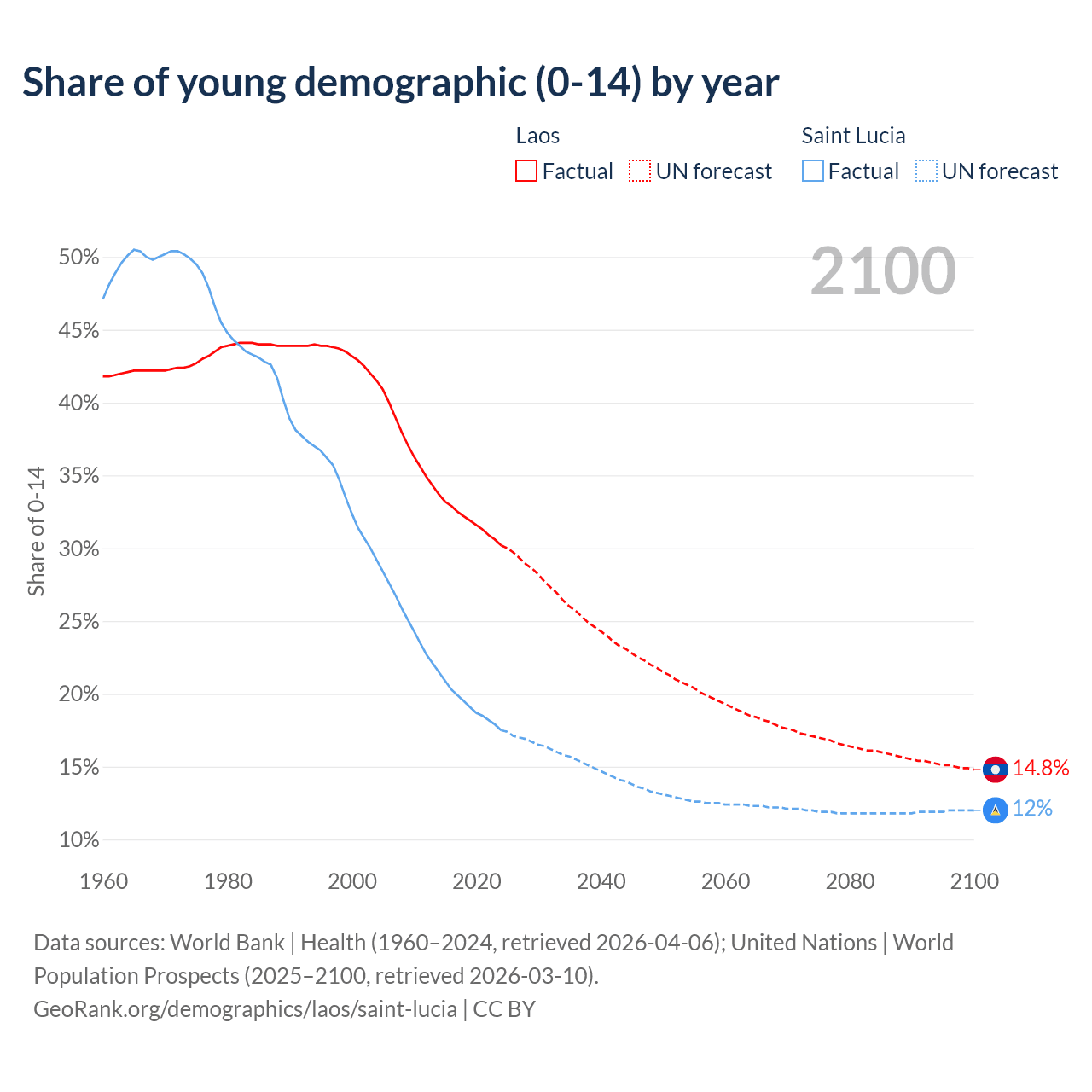 - The share of young demographic (0-15 years old) in Laos is 30.2% vs 17.5% in Saint Lucia.