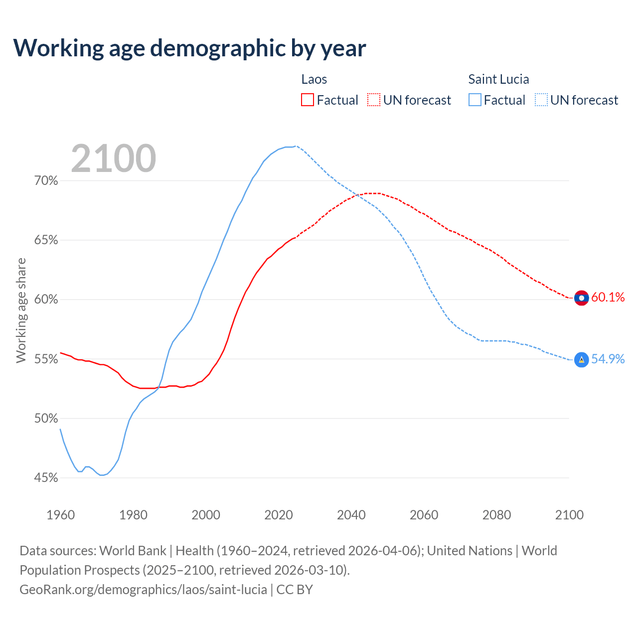 - Laos has 5.21M working age adults (aged 15-64) vs 132K in Saint Lucia.