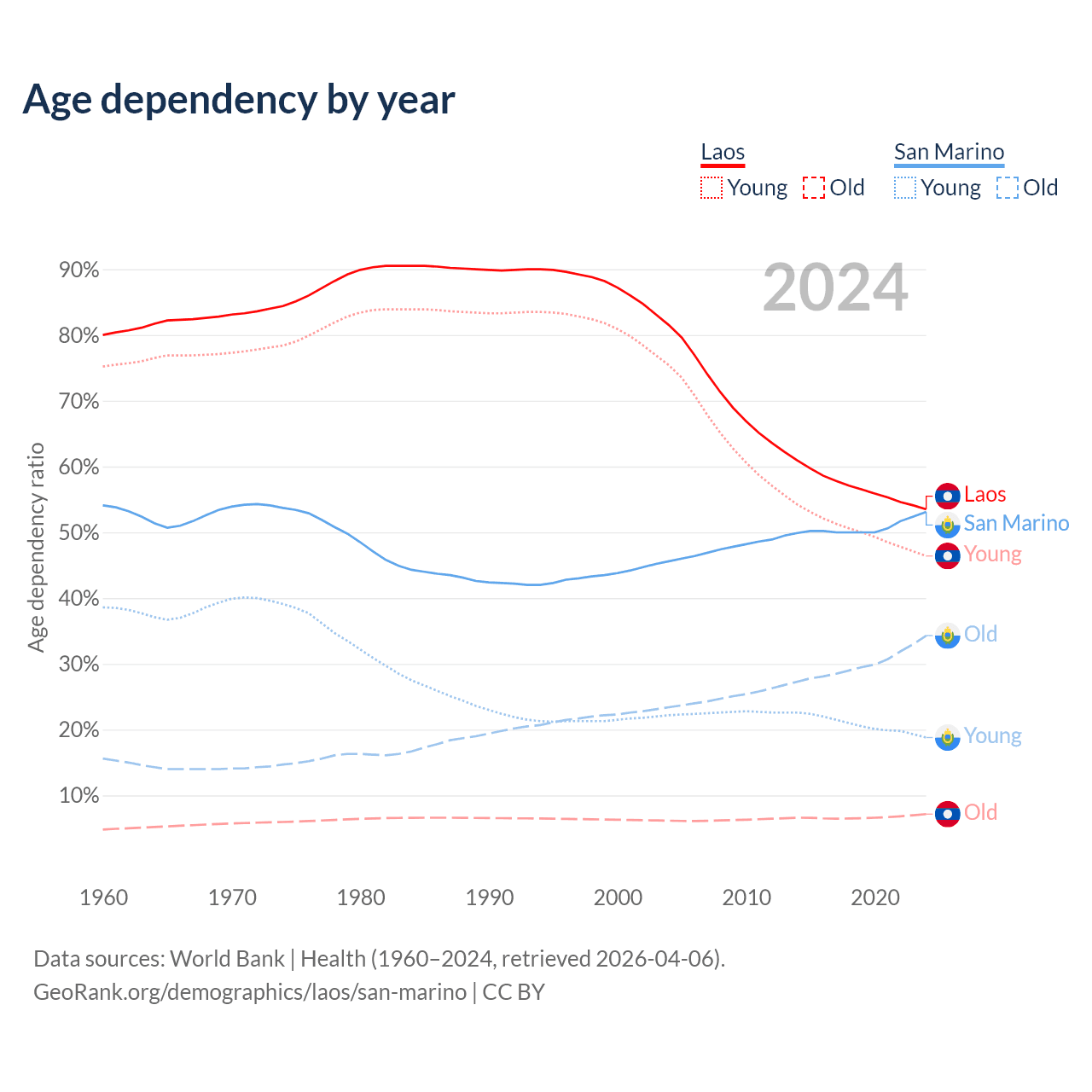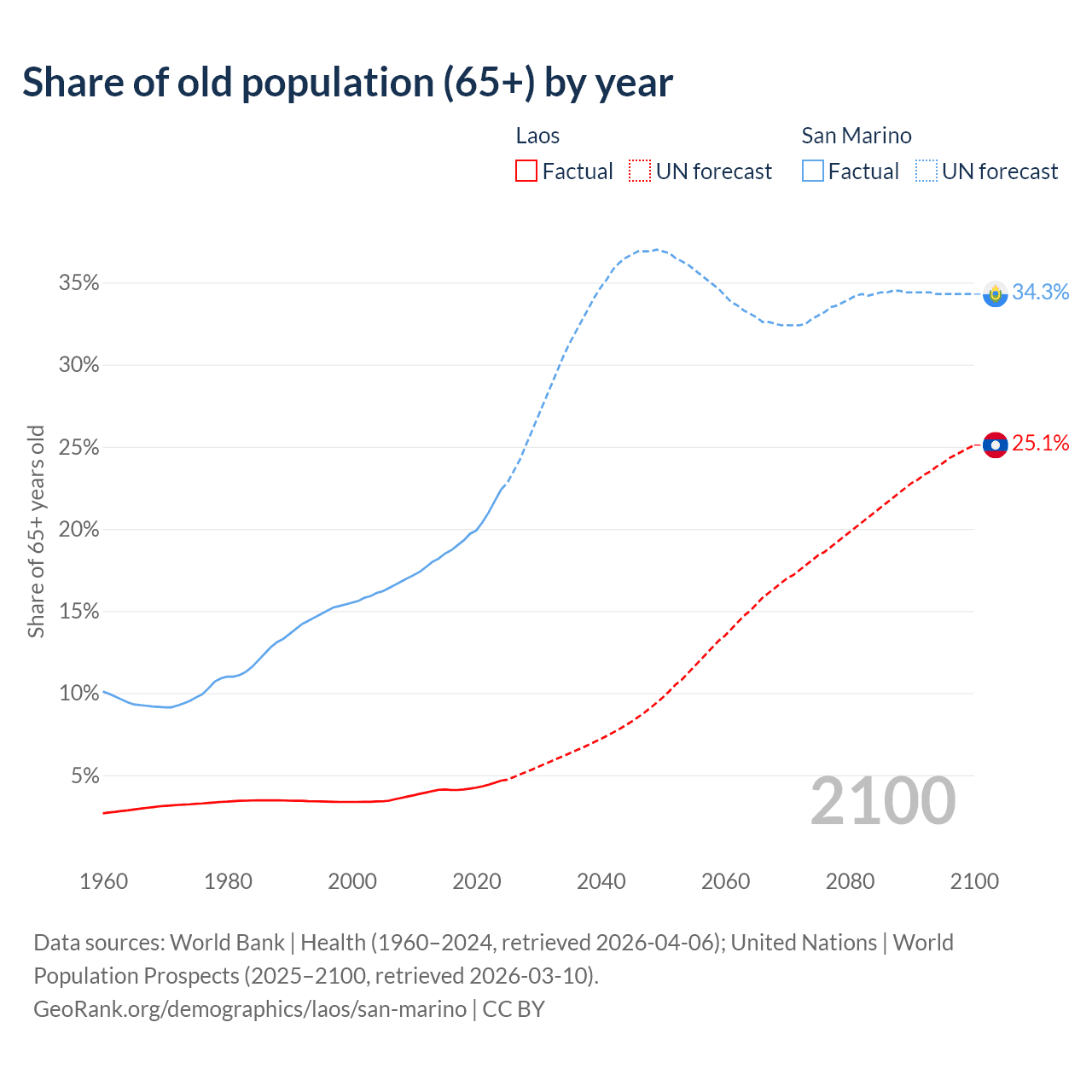 - The share of old-age demographic (65+) in Laos is 4.67% vs 22.4% in San Marino.