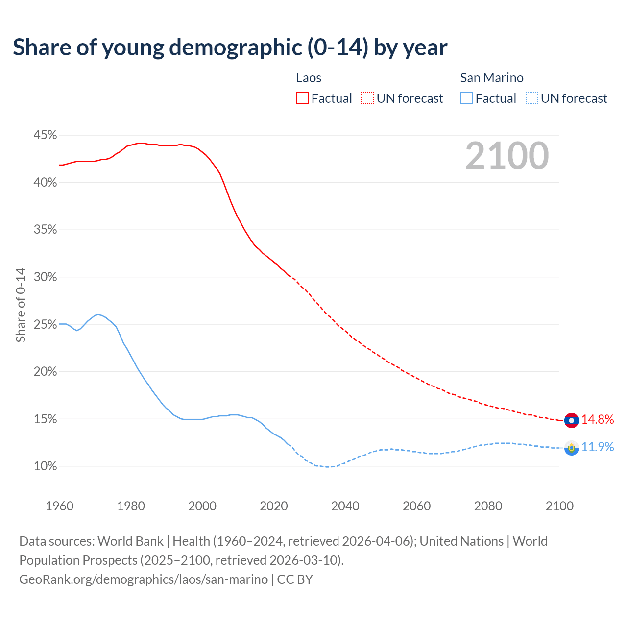 - The share of young demographic (0-15 years old) in Laos is 30.2% vs 12.3% in San Marino.