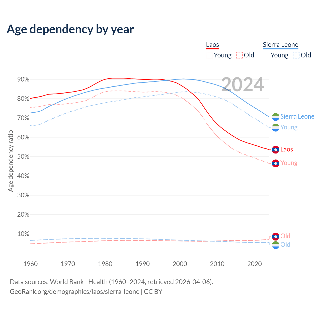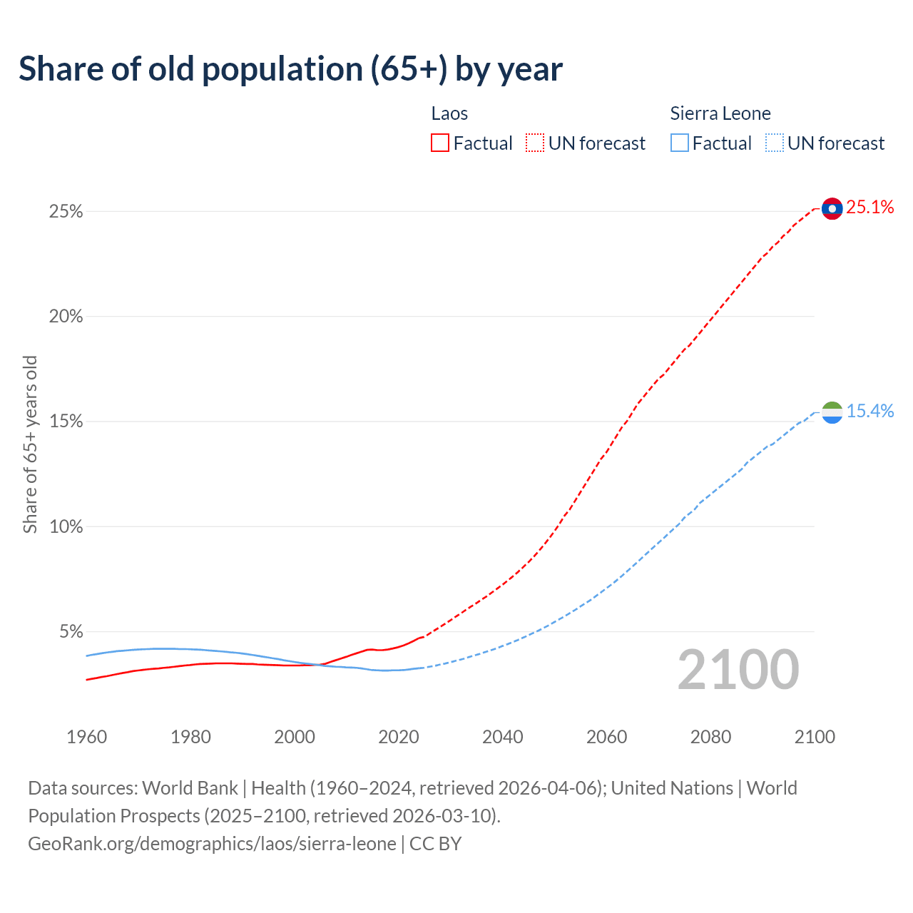 - The share of old-age demographic (65+) in Laos is 4.67% vs 3.24% in Sierra Leone.