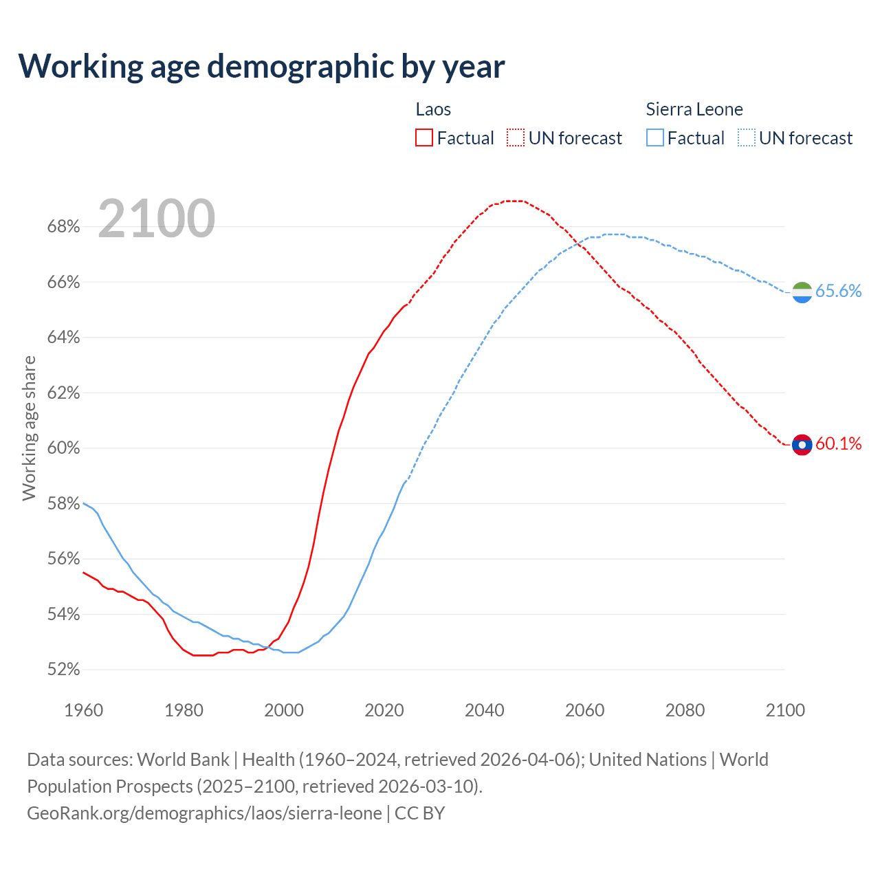 - Laos has 5.21M working age adults (aged 15-64) vs 5.31M in Sierra Leone.