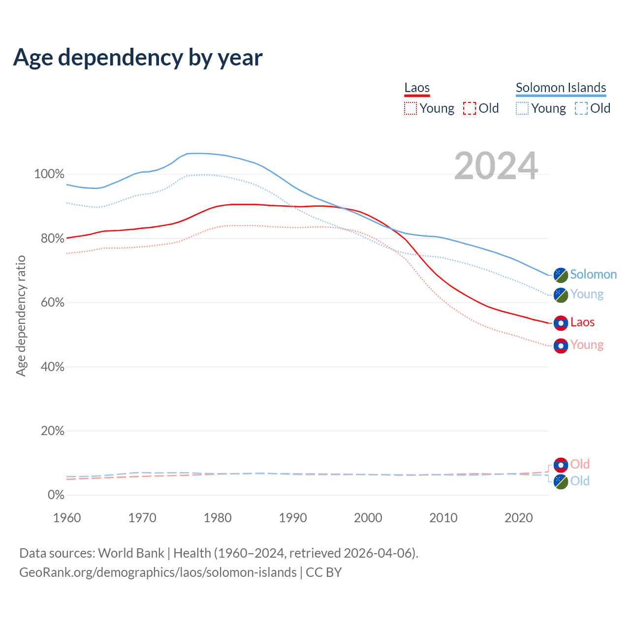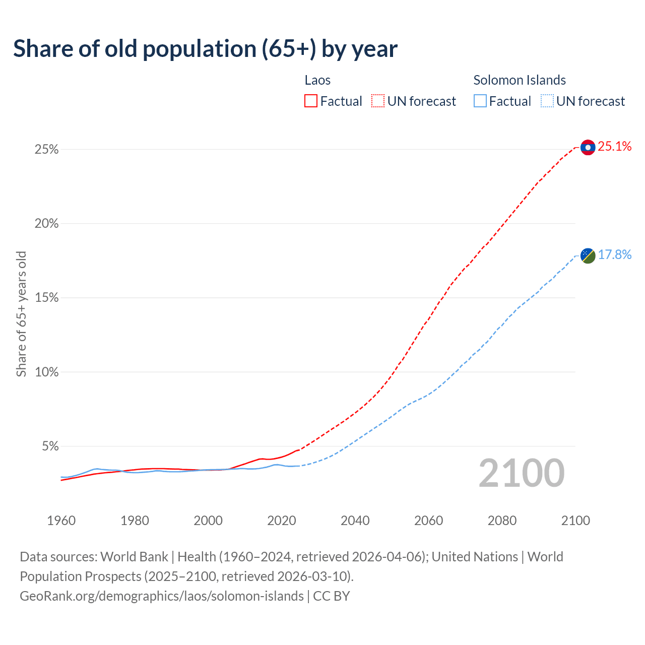 - The share of old-age demographic (65+) in Laos is 4.67% vs 3.64% in the Solomon Islands.