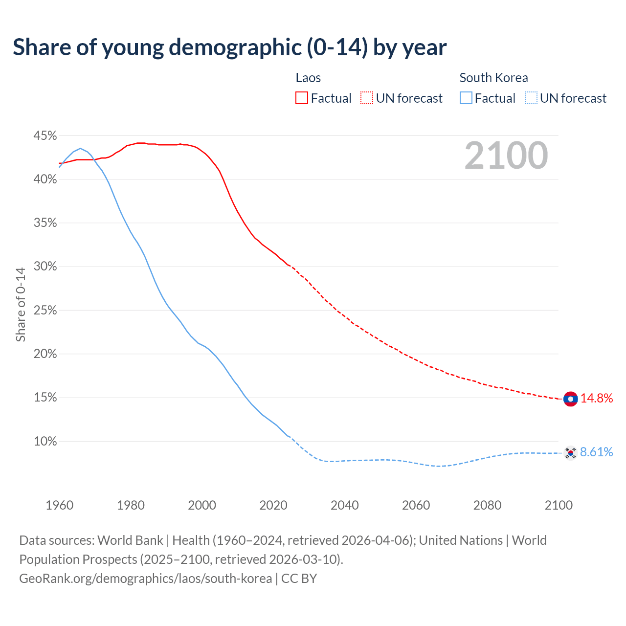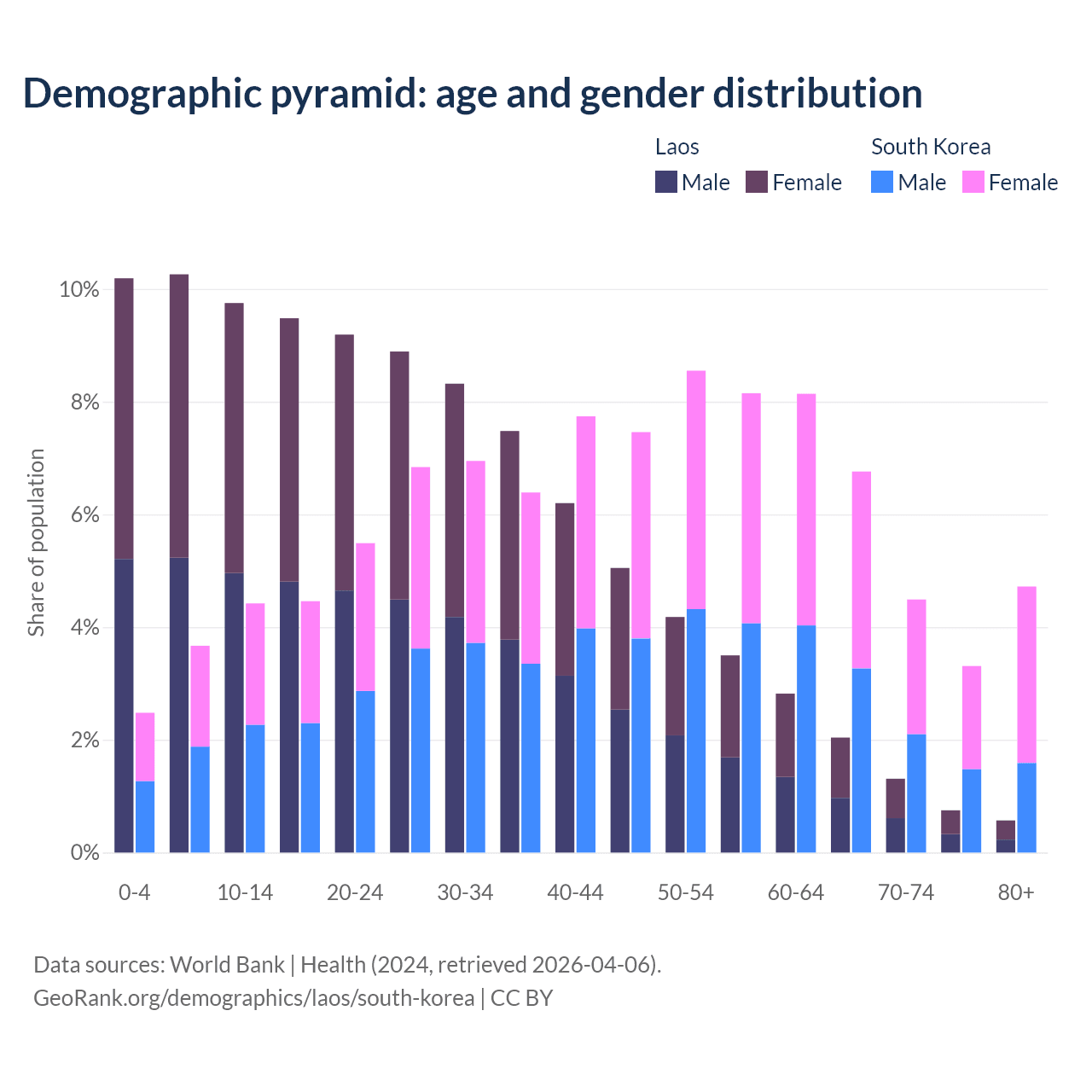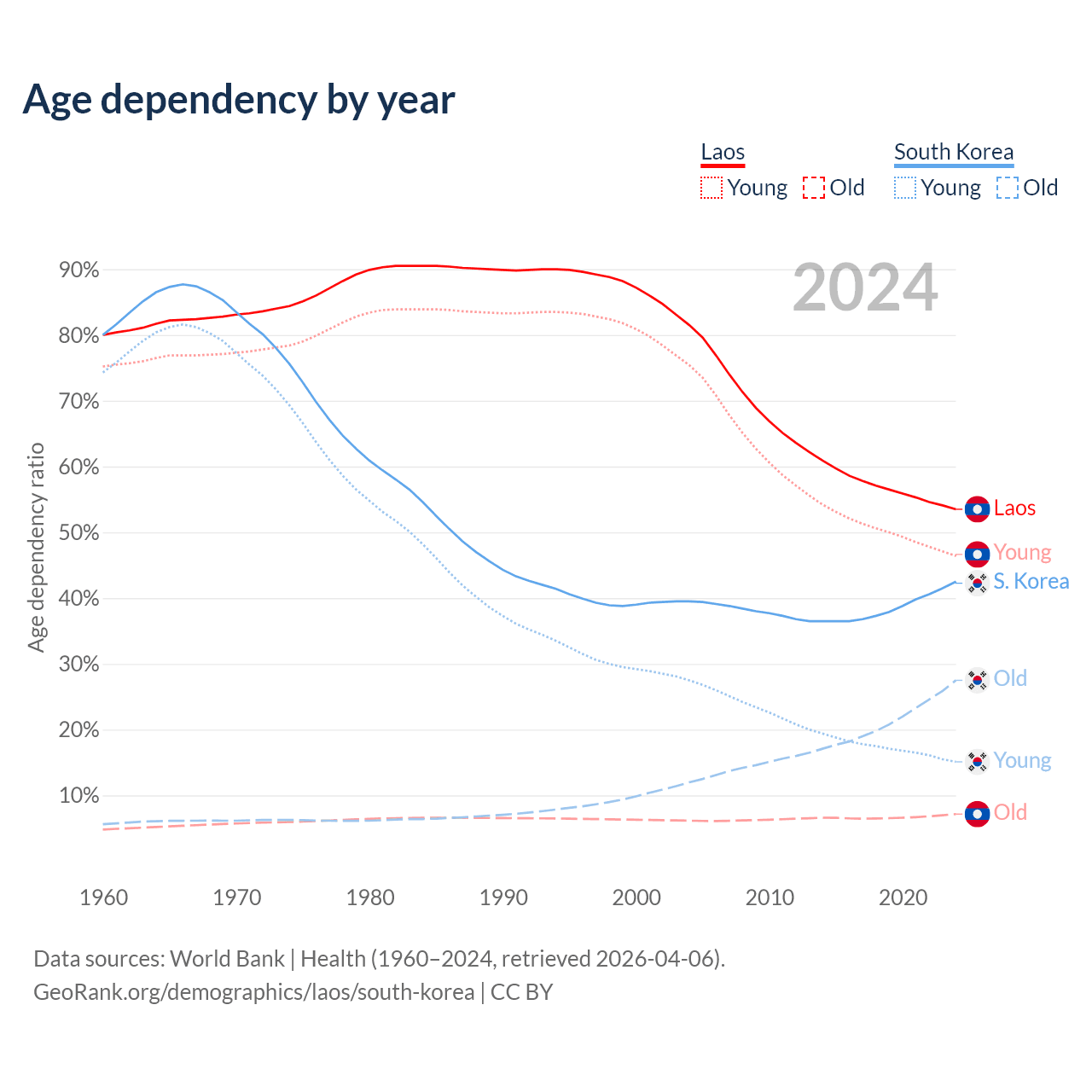 - Laos is ranked 130/196 by median age (oldest to youngest) vs 10/196 for South Korea.
