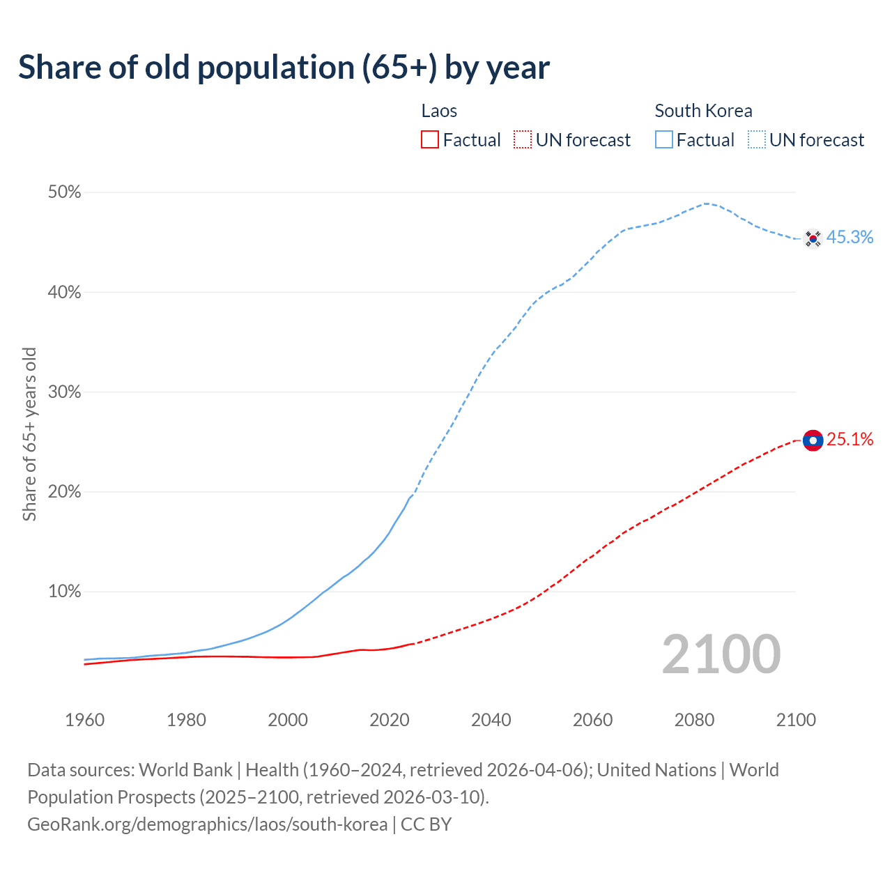 The share of older people aged 65 and over is 4.67% in Laos and 19.3% in South Korea. Life expectancy in Laos compared to South Korea .