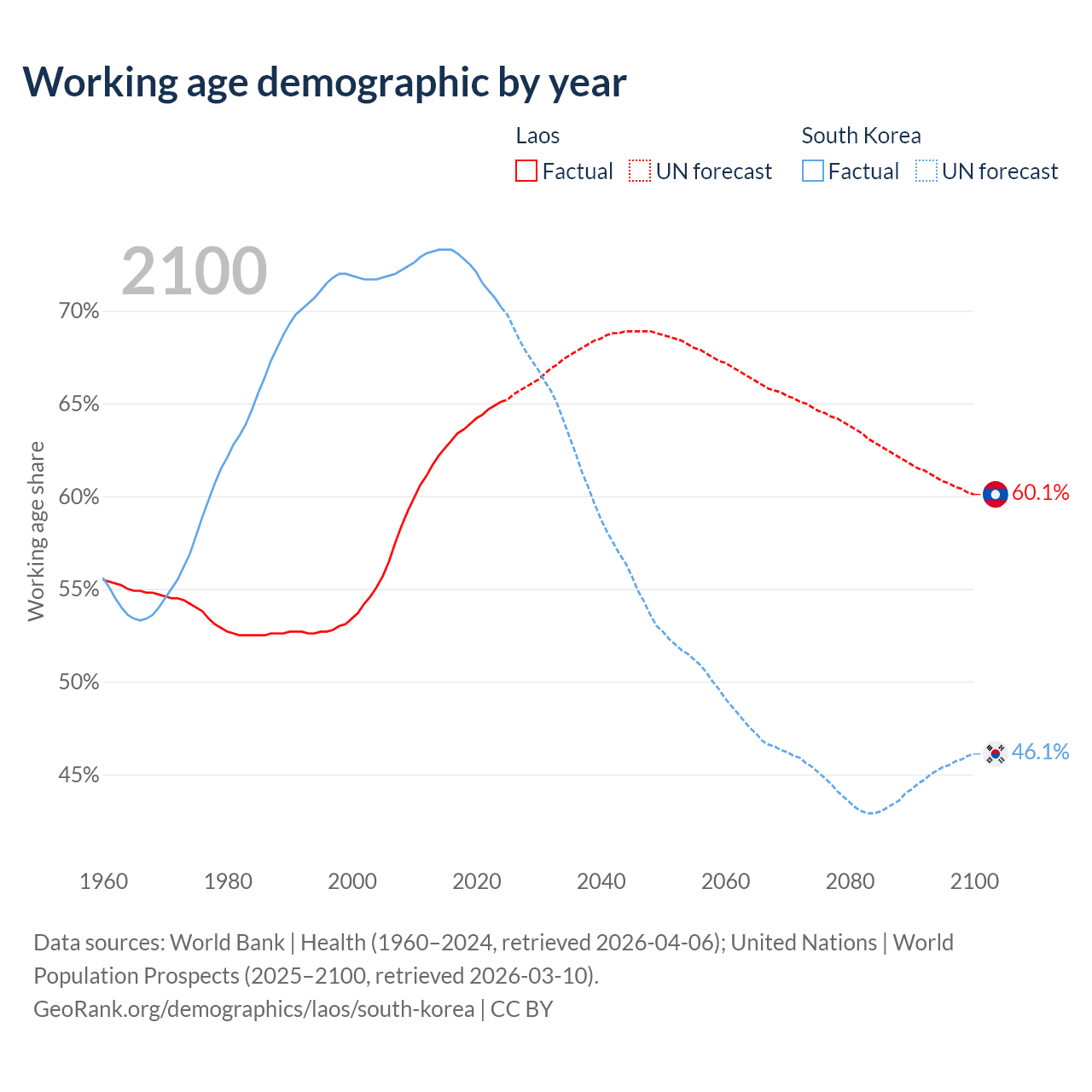 - Laos has 5.21M working age adults (aged 15-64) vs 36.2M in South Korea.