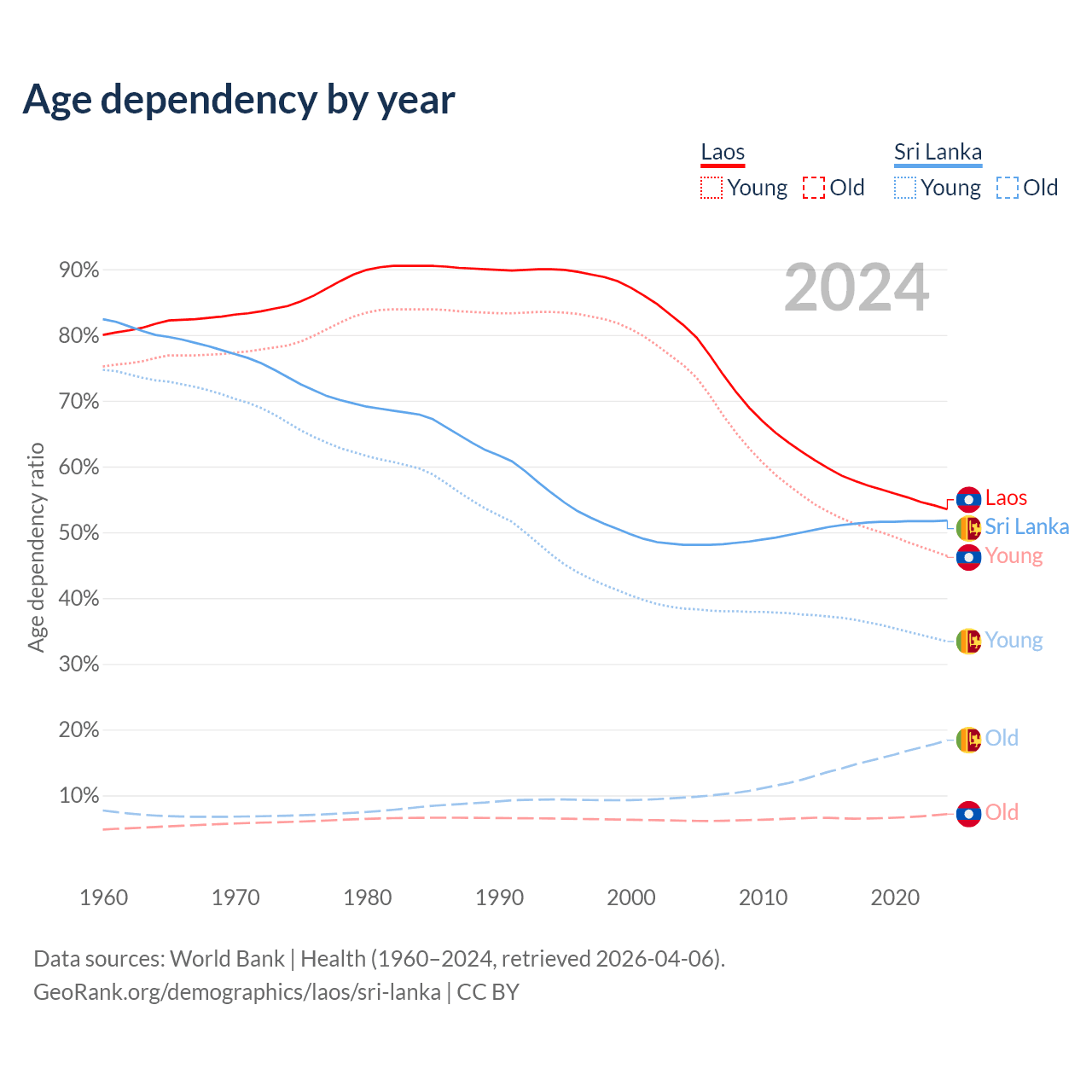 - Laos is ranked 130/196 by median age (oldest to youngest) vs 81/196 for Sri Lanka.