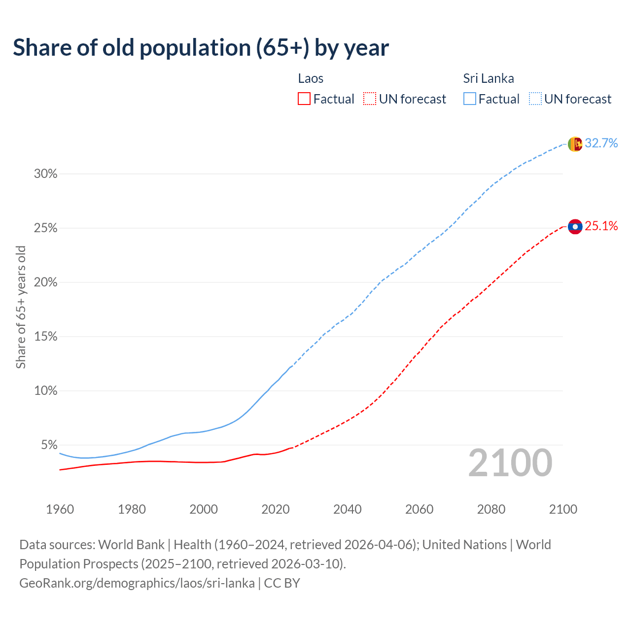 The share of older people aged 65 and over is 4.67% in Laos and 12.1% in Sri Lanka. Life expectancy in Laos compared to Sri Lanka .