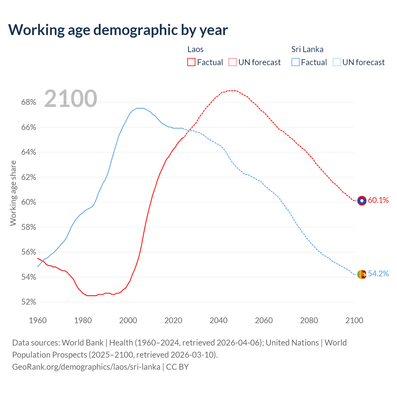 Median age Laos vs Sri Lanka, 1960-2100