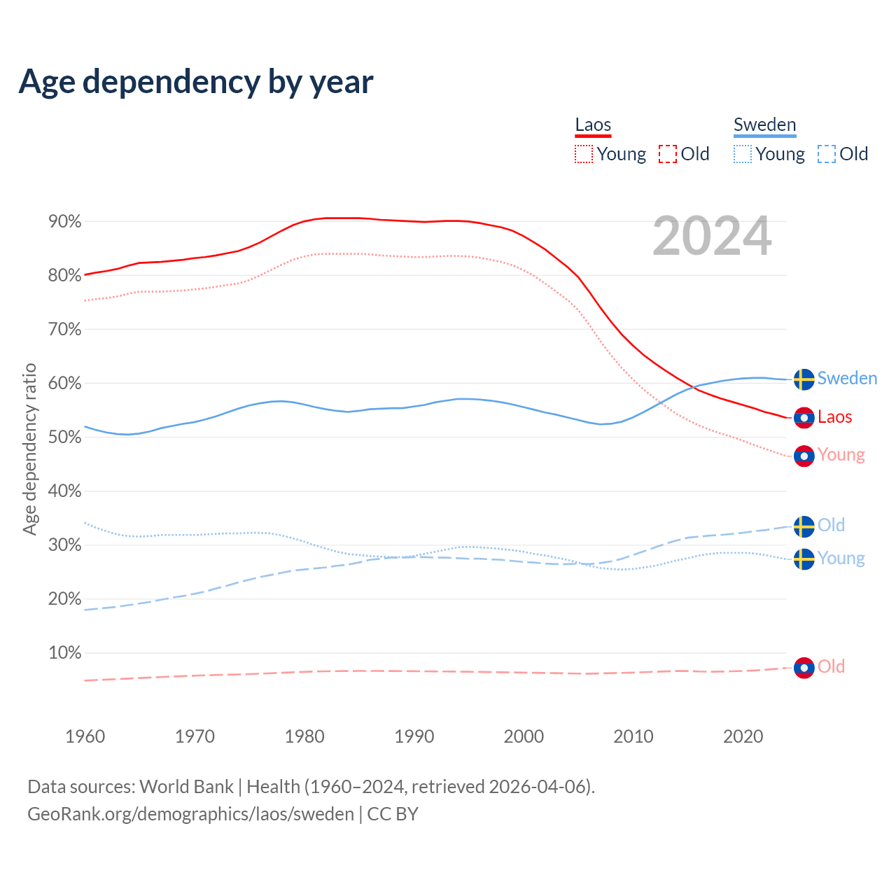 - Laos is ranked 130/196 by median age (oldest to youngest) vs 39/196 for Sweden.
