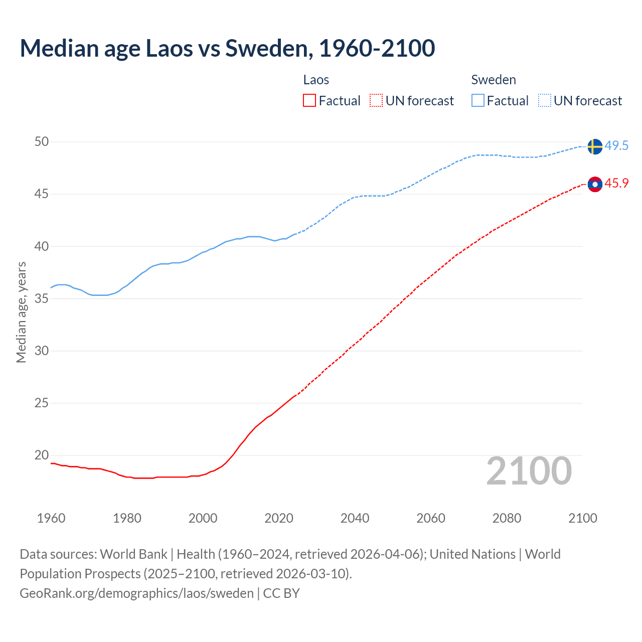 Median age Laos vs Sweden, 1960-2100