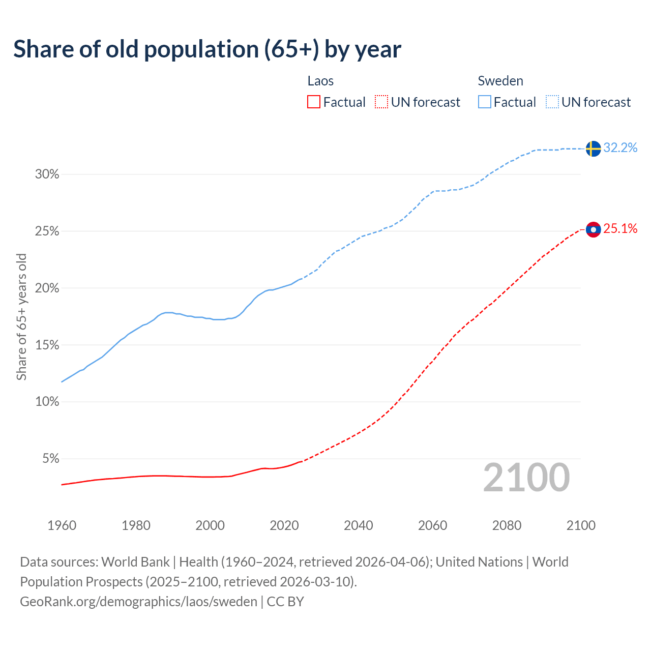 The share of older people aged 65 and over is 4.67% in Laos and 20.7% in Sweden. Life expectancy in Laos compared to Sweden .