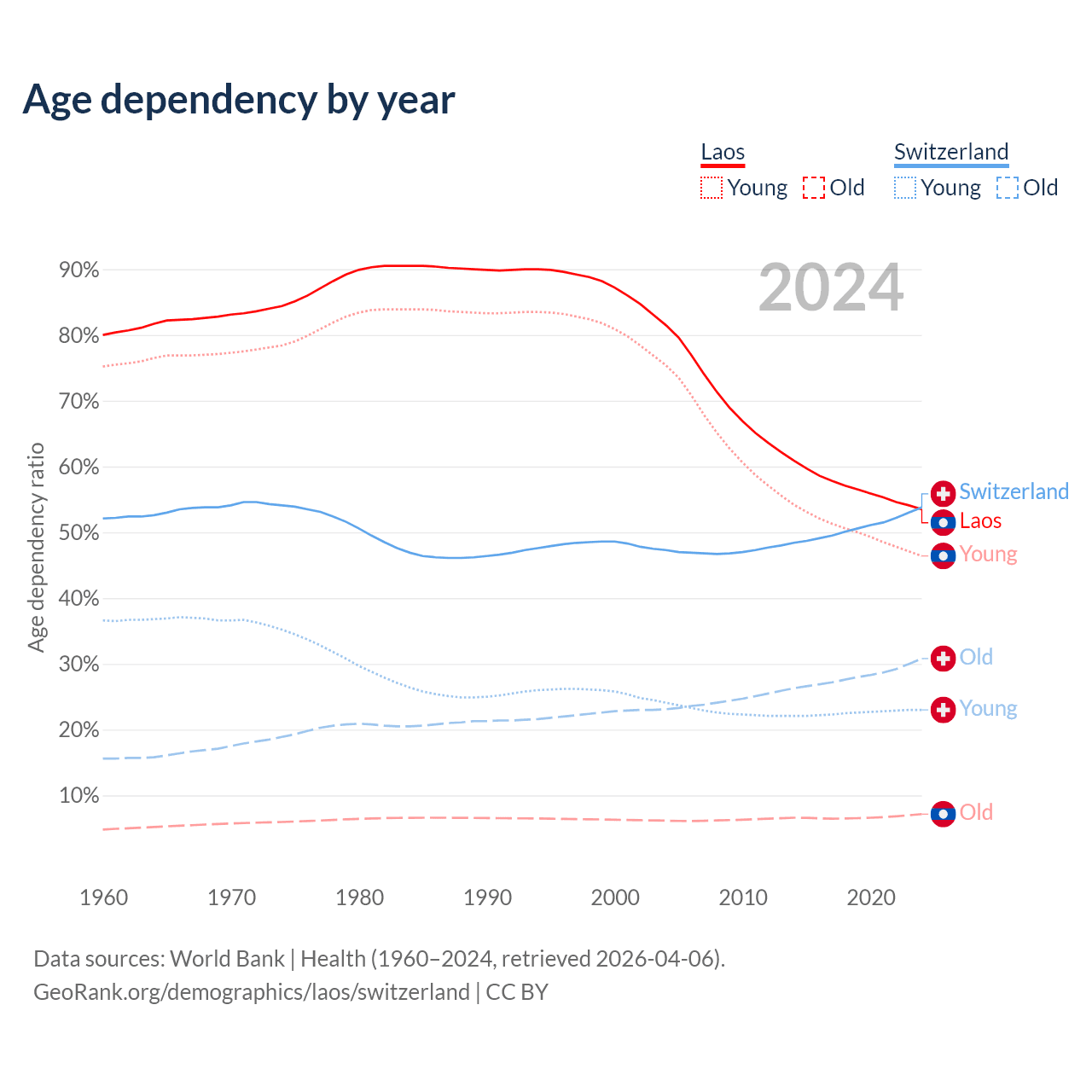 The share of older people aged 65 and over is 4.67% in Laos and 20% in Switzerland. Life expectancy in Laos compared to Switzerland .