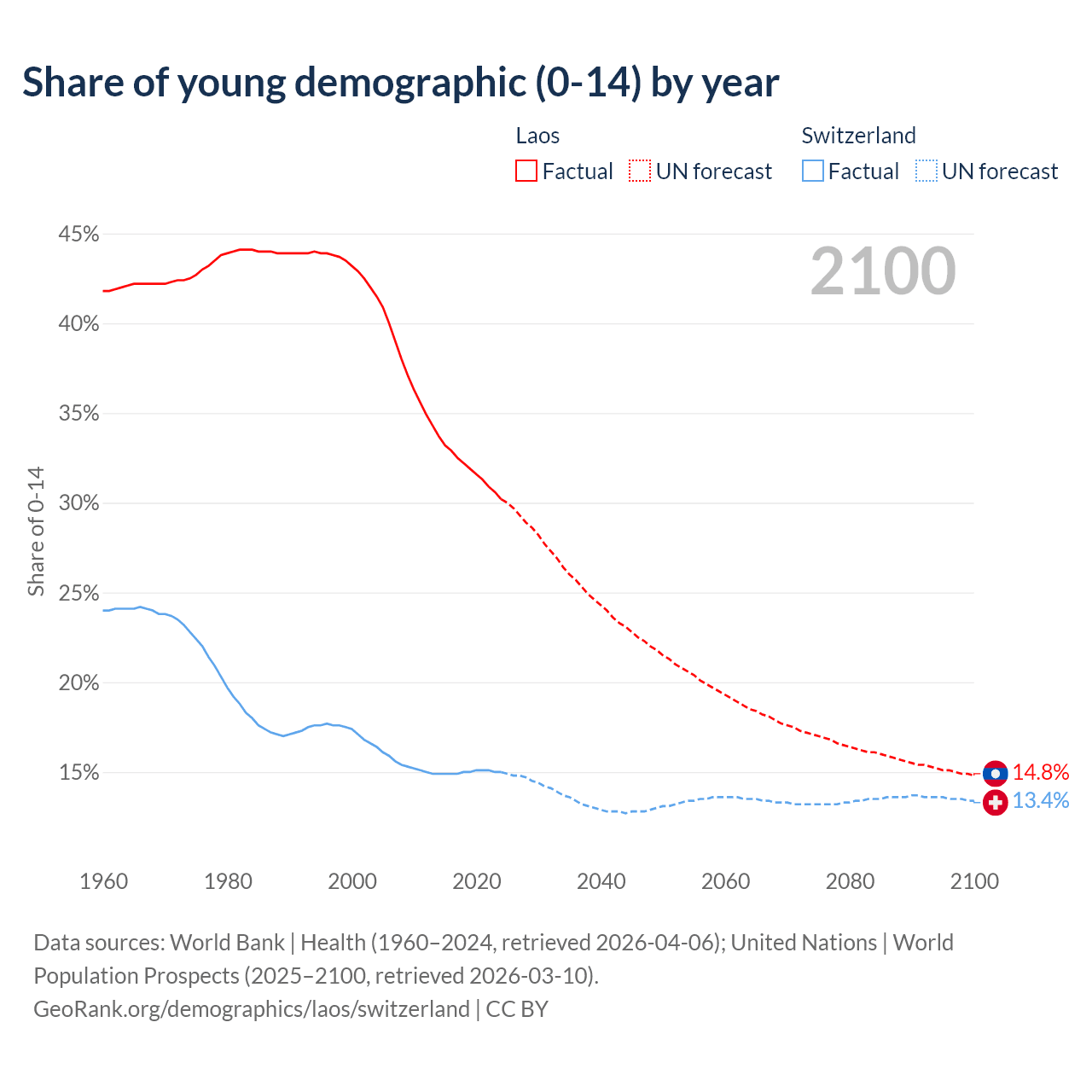 - The share of young demographic (0-15 years old) in Laos is 30.2% vs 15% in Switzerland.