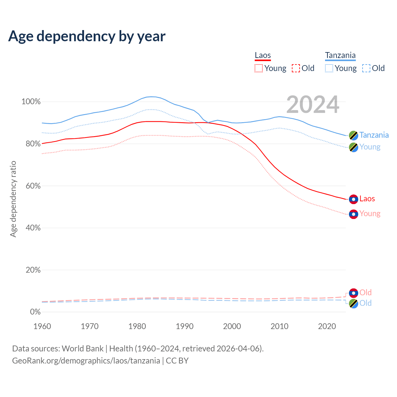 Data sources: World Bank | Health (1960–2024, retrieved 2026-04-06); U.S. Census Bureau (1960–2024, retrieved 2026-02-08).