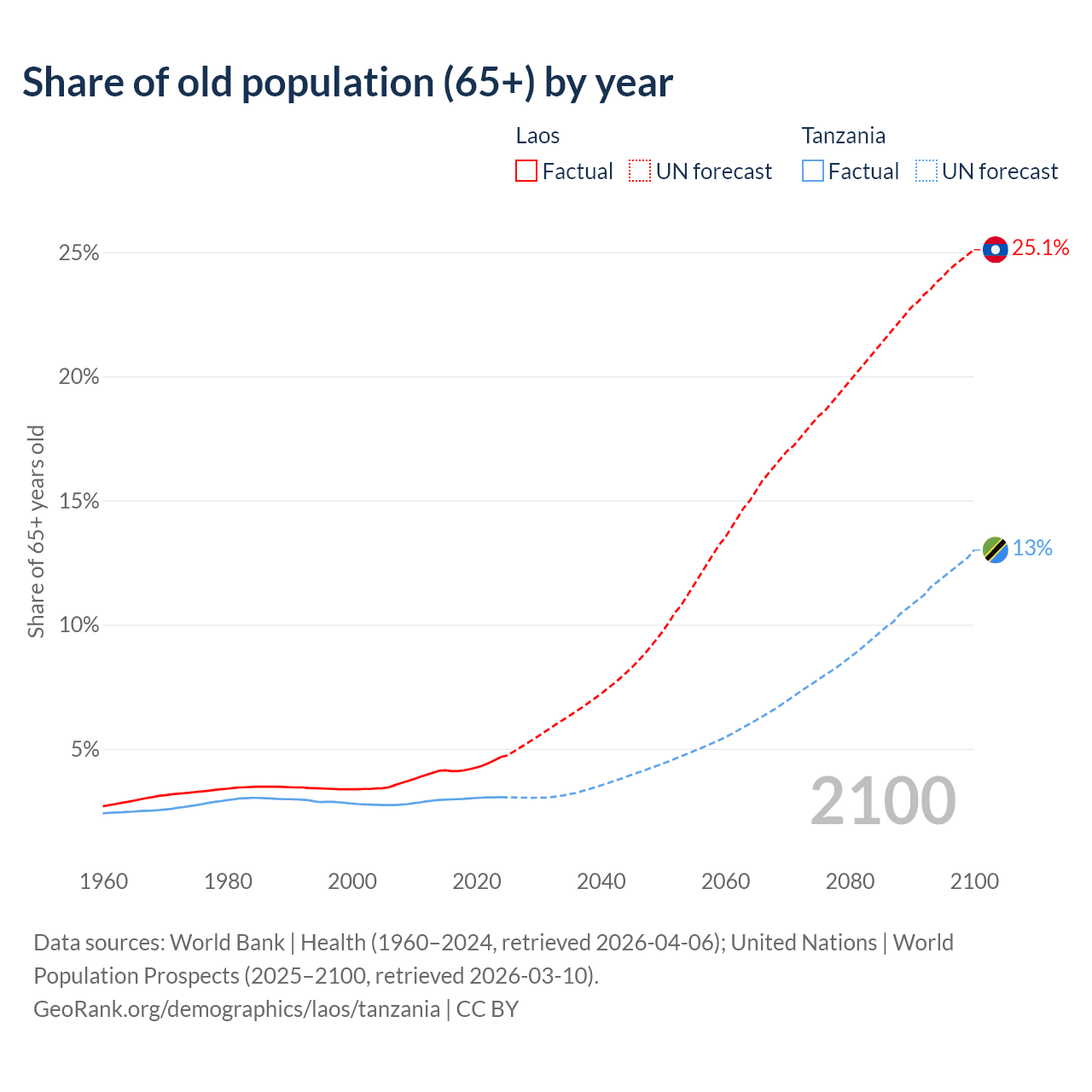 - The share of old-age demographic (65+) in Laos is 4.67% vs 3.05% in Tanzania.