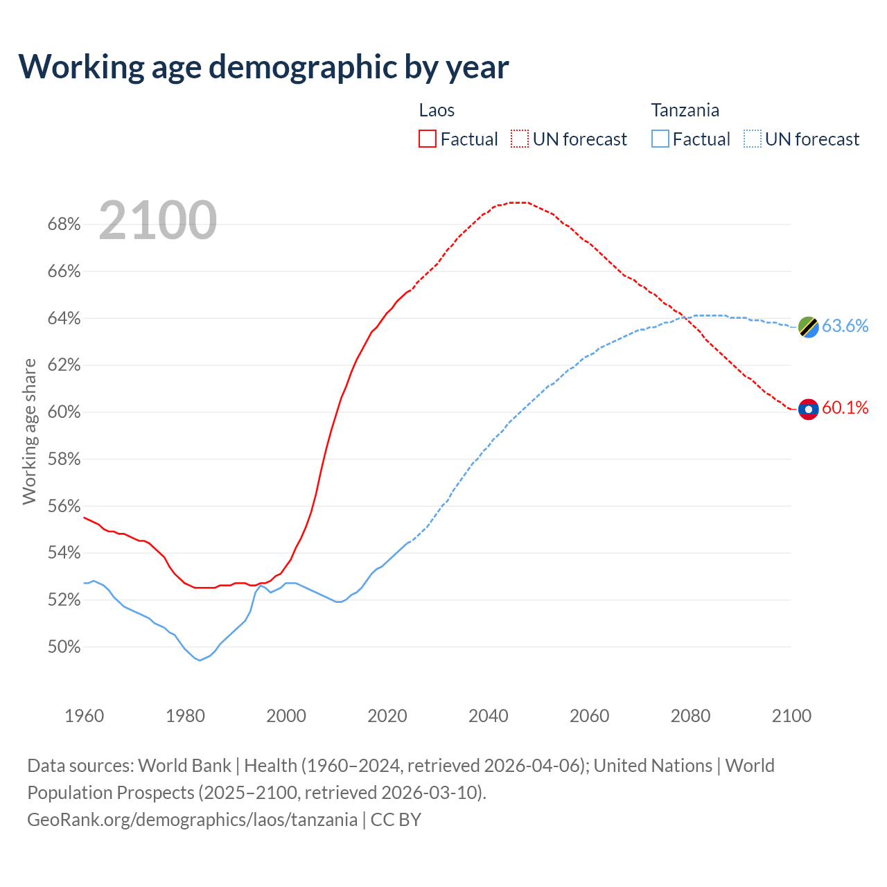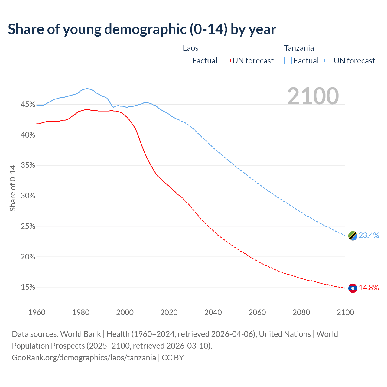 Median age Laos vs Tanzania, 1960-2100