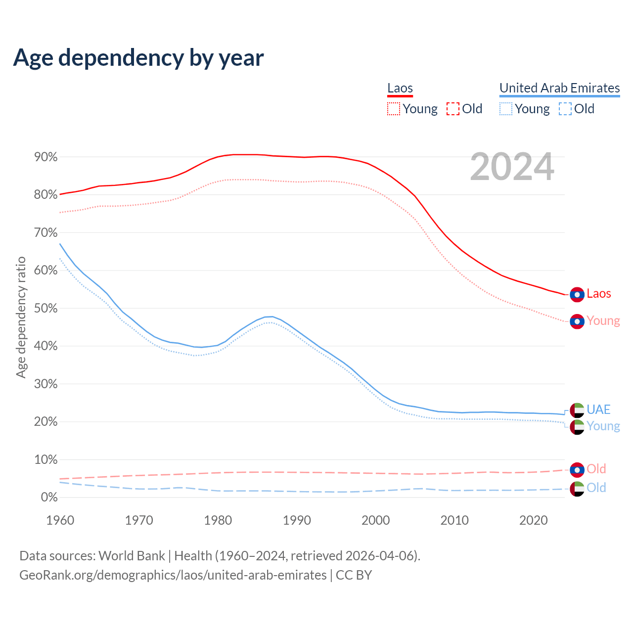 - Laos is ranked 130/196 by median age (oldest to youngest) vs 91/196 for the United Arab Emirates.
